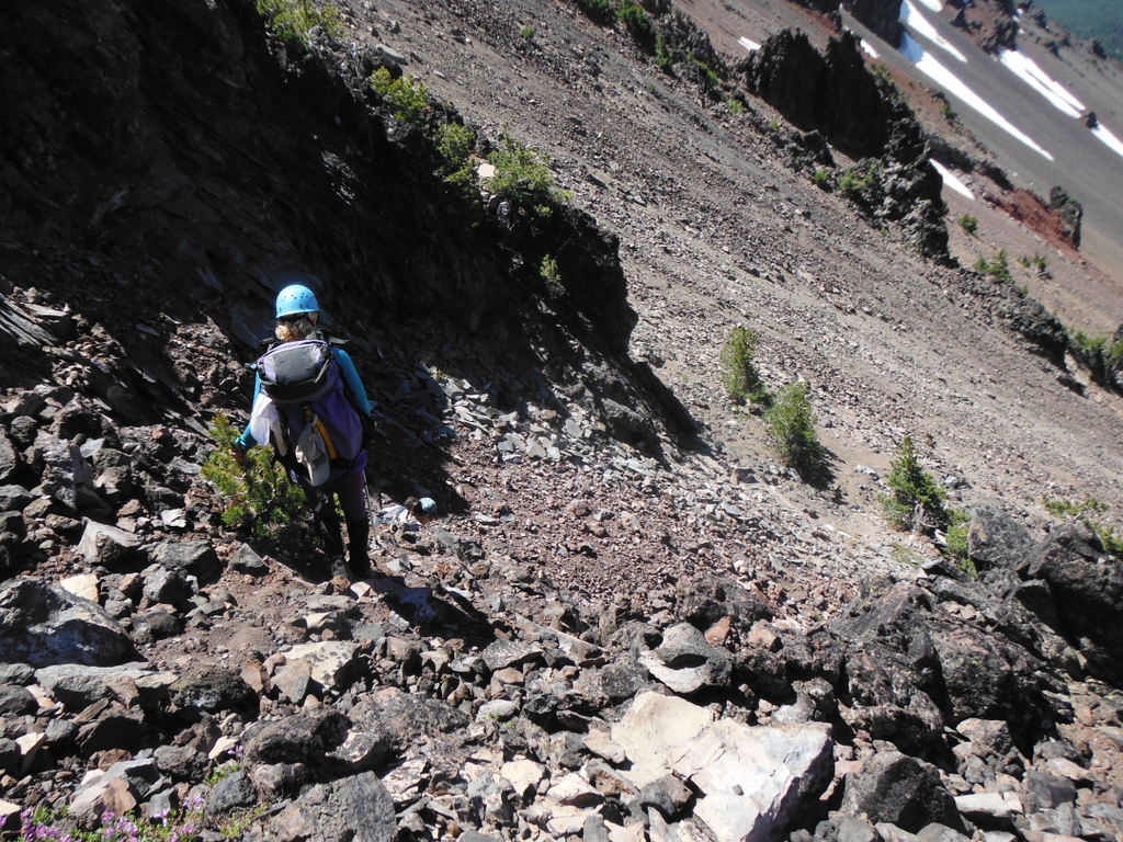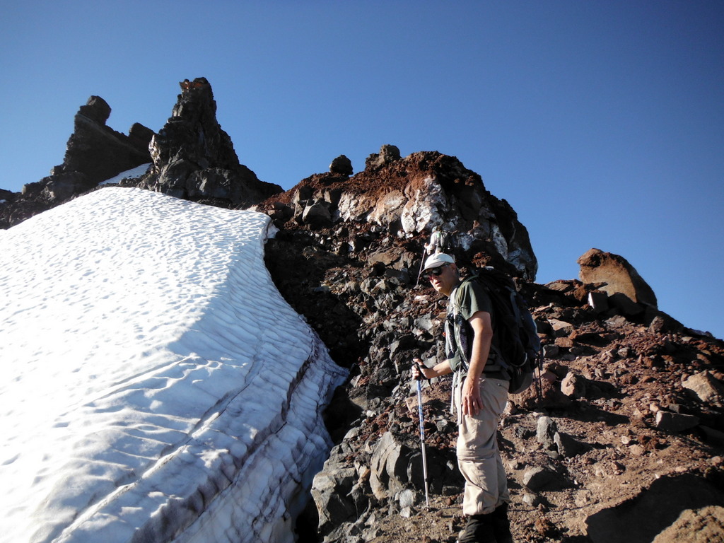 You might start towards Broken Top on the four mile Green Lakes Trail that is about 25 miles west of Bend on the Cascade Lakes Highway. Our party camped in one of the designated campsites - #19 - that happens to be the start of the climbers trail to the saddle accessing the northwest ridge. The northwest ridge leads you to a 15 foot vertical rock band requiring fifth class skills - many people protect on this pitch and rappel down it as we did. This vertical rock leads to an exposed, narrow catwalk about 30 meters long with foot placements perhaps four to eight inches wide. And finally a fourth class scramble to top of the summit pinnacle.