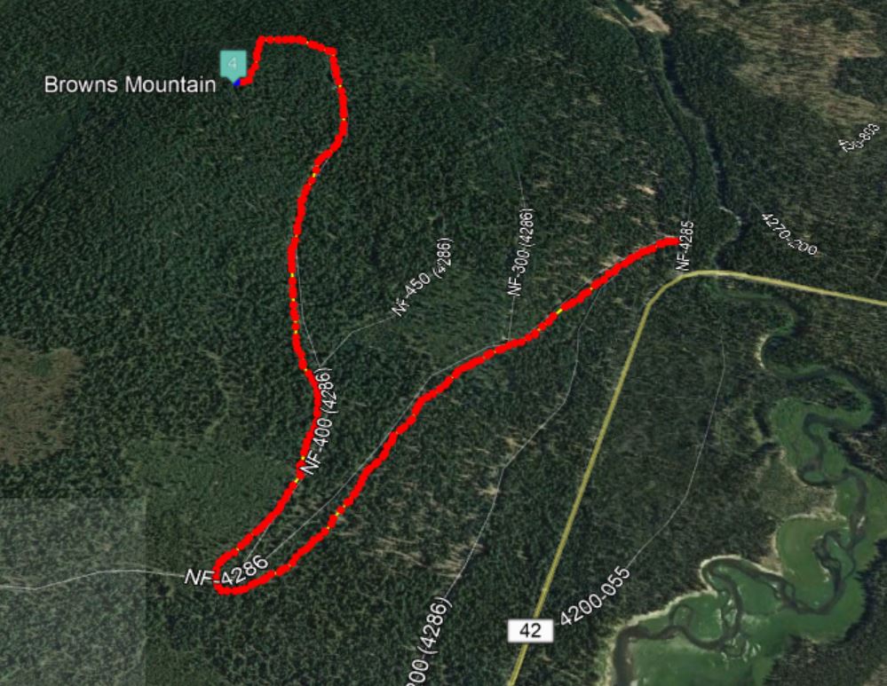 Browns Mountain, west of Sunriver, despite being pretty close to a paved road, was a tough bushwack for Roland-K7FOP and I, as we pursued several "shortcuts." So we recommend walking about 2.4 miles on forest roads, and a final steep ascent of about 1/10 mile. Total is about 900 feet of gain. If there's a better way to get to the AZ, please write up an updated trip report.