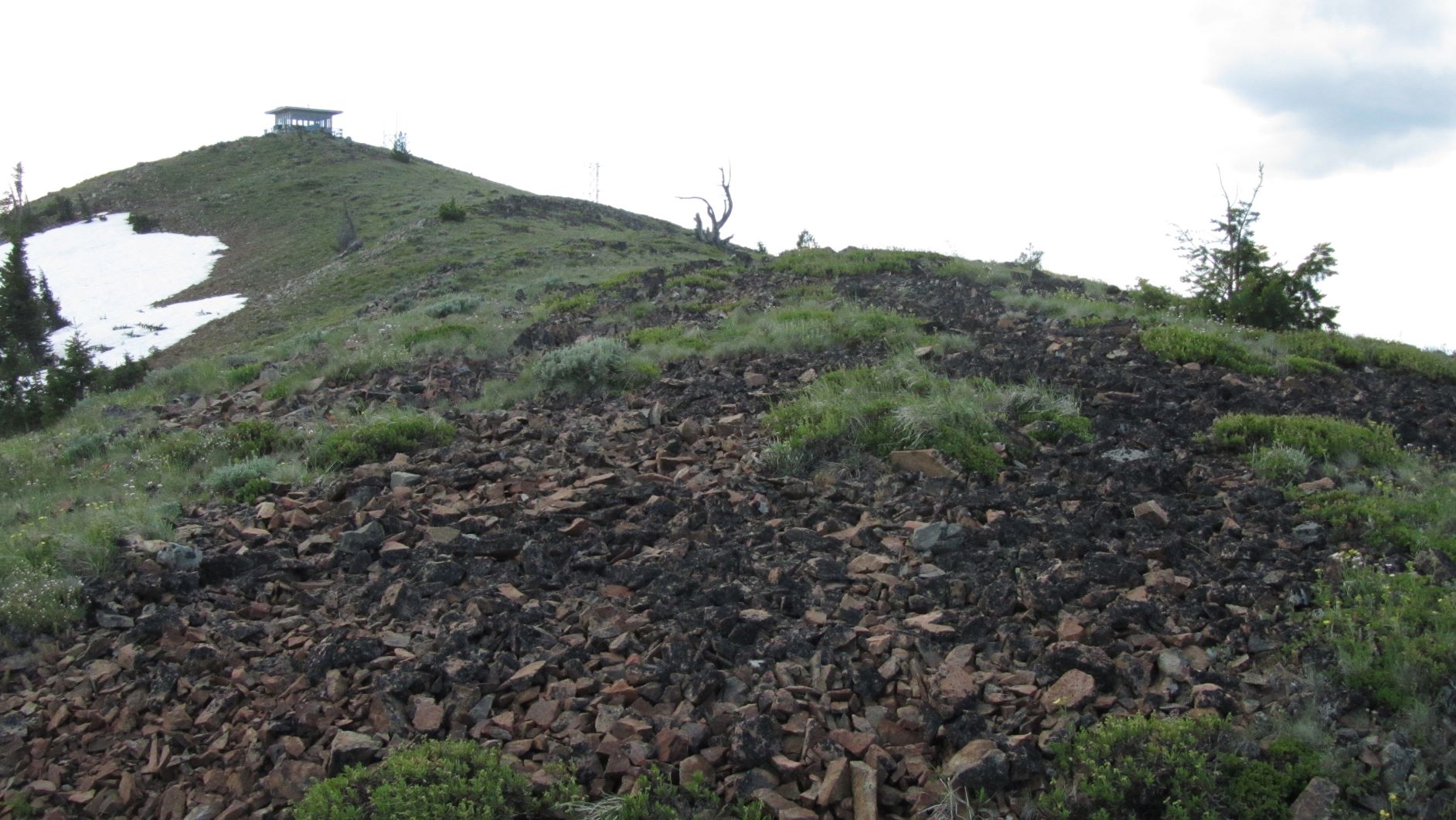 If you find yourself along the eastern stretches of Highway 26 and have a high clearance vehicle, this would be a nice hike of about 2.5 miles round trip to an operating fire lookout. You may elect to drive to the summit, but you may find it more comfortable to hike the narrow steep section. There was snow partially blocking the road in late June, another reason to walk the last bit.
