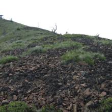 From this point is about 0.75 miiles to a saddle, but the road is very narrow with no possible way to turn around until the saddle. This portion of the road bed is large, fist-sized rocks that can rolle under the vehicle and compromise ground clearance. After the saddle the road narrowed more - it's another 0.5 miles to the lookout at the top.
