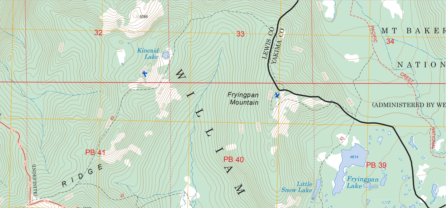 We continued about another two miles to camp on the far eastern shore of Fryingpan Lake with a view of Fryingpan Mountain. From here, find the Kincaid Lake Trail that heads north, rough and steep about 1.1 miles with nowhere near enough switchbacks. In a few places the tread was elusive. Where the trail tops out you can turn left and have an easy bushwack several hundred feet (not vertical) to the summit proper. There's a great operating position on a log, a spot that could accommodate a small tent, and some peek-a-boo views of the surrounding mountains. There was good T-Mobile, AT&T and Verizon coverage from the summit, but don't expect it anywhere else. An alternative might be to take the Kincaid Lake Trail #42 from just west of the Soda Springs Horse Camp and activate Carlton Ridge W7W/PL-027 and then approach Fryingpan Mountain from the north. A snip from the FS Topo map is included below - the blue "X" mark the locations of Carlton Ridge and Fryingpan Mountain - the full map can be found here:     https://data.fs.usda.gov/geodata/rastergateway/data3/46121/fstopo/White_Pass_463712122_FSTopo.pdf.
