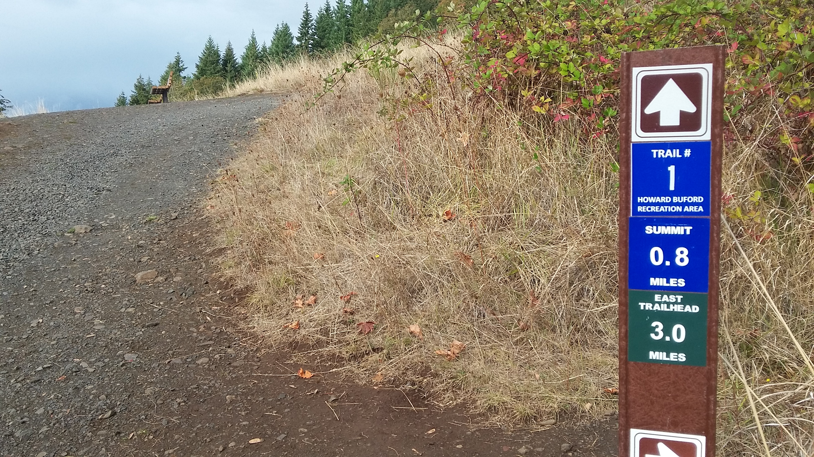 Note that a Lane County Park Pass or a $4 permit is required at the parking lot. You can exit I-5 at E. 30th Avenue and then use the east side frontage road to go north to Franklin Blvd. This will take you to Seavey Loop Rd that heads east toward the park. You'll cross a bridge and then head south into the slightly confusing parking area. The trailhead is near the pay station at a large gate. From the trailhead you'll keep on up the main track - it appears to be Trail 1 - to the summit. There are trail markers along the way - look for the word "Summit" to indicate the direction to go at any junction - but the path to take is the wide, well-graveled, and sometimes steep one. The last half mile is in a little worse condition, but it is just as wide. At the summit there is a concrete trig point at the and a bench facing east. To the south there are trees that could be used for antennas - but since this is a formal arboretum I suggest that you would avoid any activity that could damage the trees.