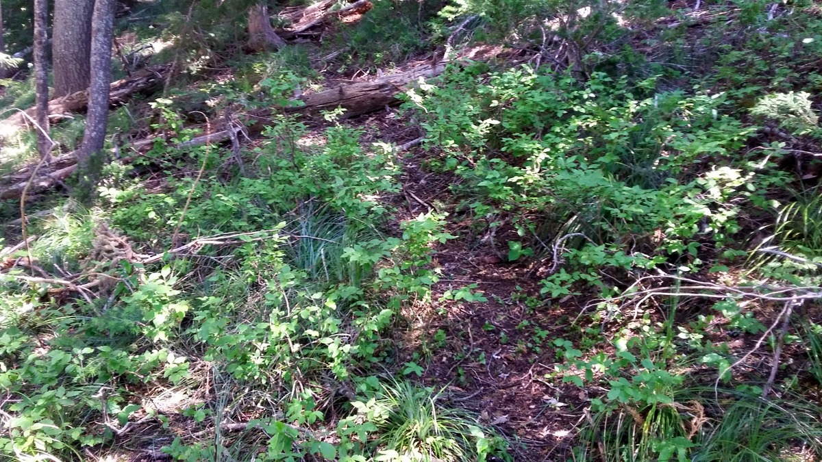The abandoned trail to the lookout site starts here - look in the woods north of the parking spot. The trail appears and disappears at intervals but roughly follows the ridge (photo). There is also an old steel telephone line through the woods - if you see that occasionally you are on the right path. It's about 0.3 miles and 400 feet gained to the summit. At the summit there is the site of a lookout and a few small trees to lean an antenna pole against.