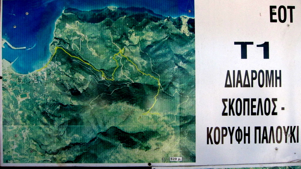 The T1 trail can also be started in several places along the road that heads to Moni Sotiros and towards the summit - in fact, about 0.7km of T1 follows the road. Note that the sign for "Palouki" at the left branch of the Y goes to Moni Evggelismou Tis Theotokou - you want the right branch at the Y to Moni Sotiros. The easiest for driving and still do some hiking would be to start the T1 from a sharp switchback near 39.120475, 23.748972 (trail length 3.1km, gain 430m). The next might be at a road junction with a shelter near 39.122608, 23.755984 (trail length 1.8km, gain 220m). And the last could be near a large cistern at the location 39.116985, 23.764550. From this last location the summit is about 0.8km and gain 170m.