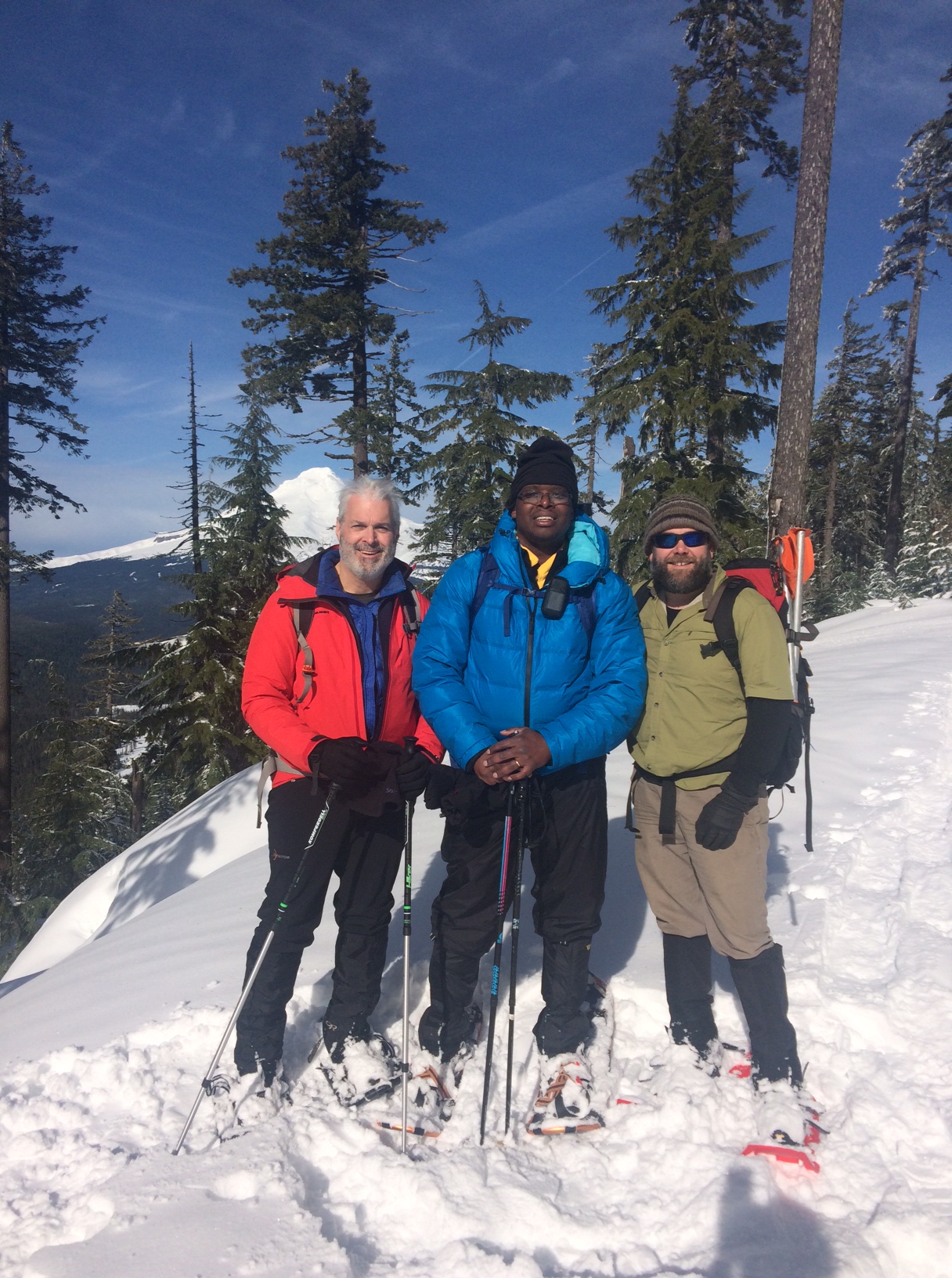 Park at the Frog Lake SnoPark, about 12 miles east of Government Camp on Highway 26 (in winter, an Oregon SnoPark Pass is required). Cross Highway 26 to the trailhead for Pacific Crest National Scenic Trail (PCT) - it's quite obscure in the winter but it starts near the highway sign for Frog Lake. Here's a spot where a GPS will be very useful. The Blue Box Trail proceeds more or less directly towards the summit. The AZ is roughly 300 meters in diameter - once we passed into the clearcut area we set up and operated. We found no T-Mobile cell service and surprisingly, no APRS coverage, so self-spotting was a problem.