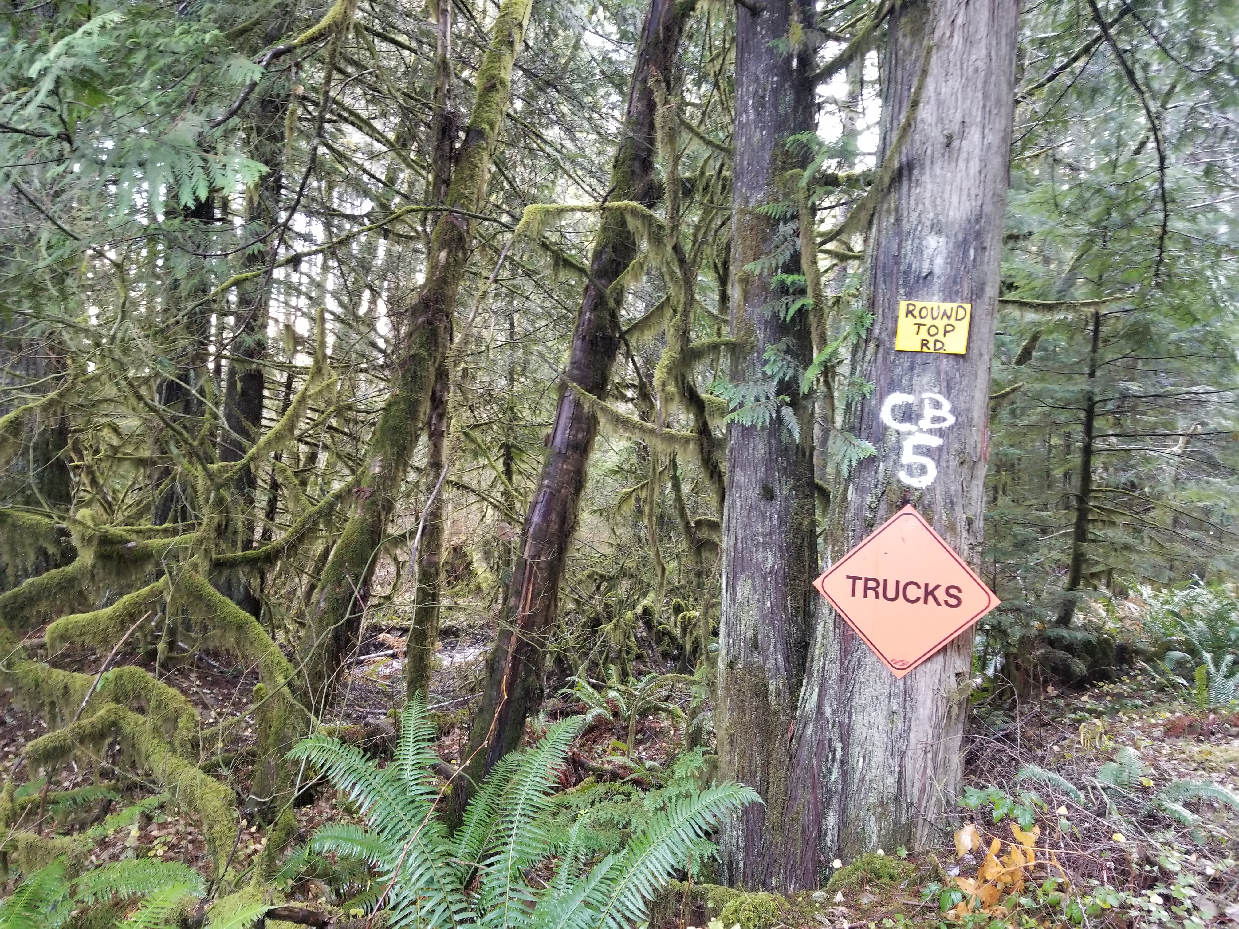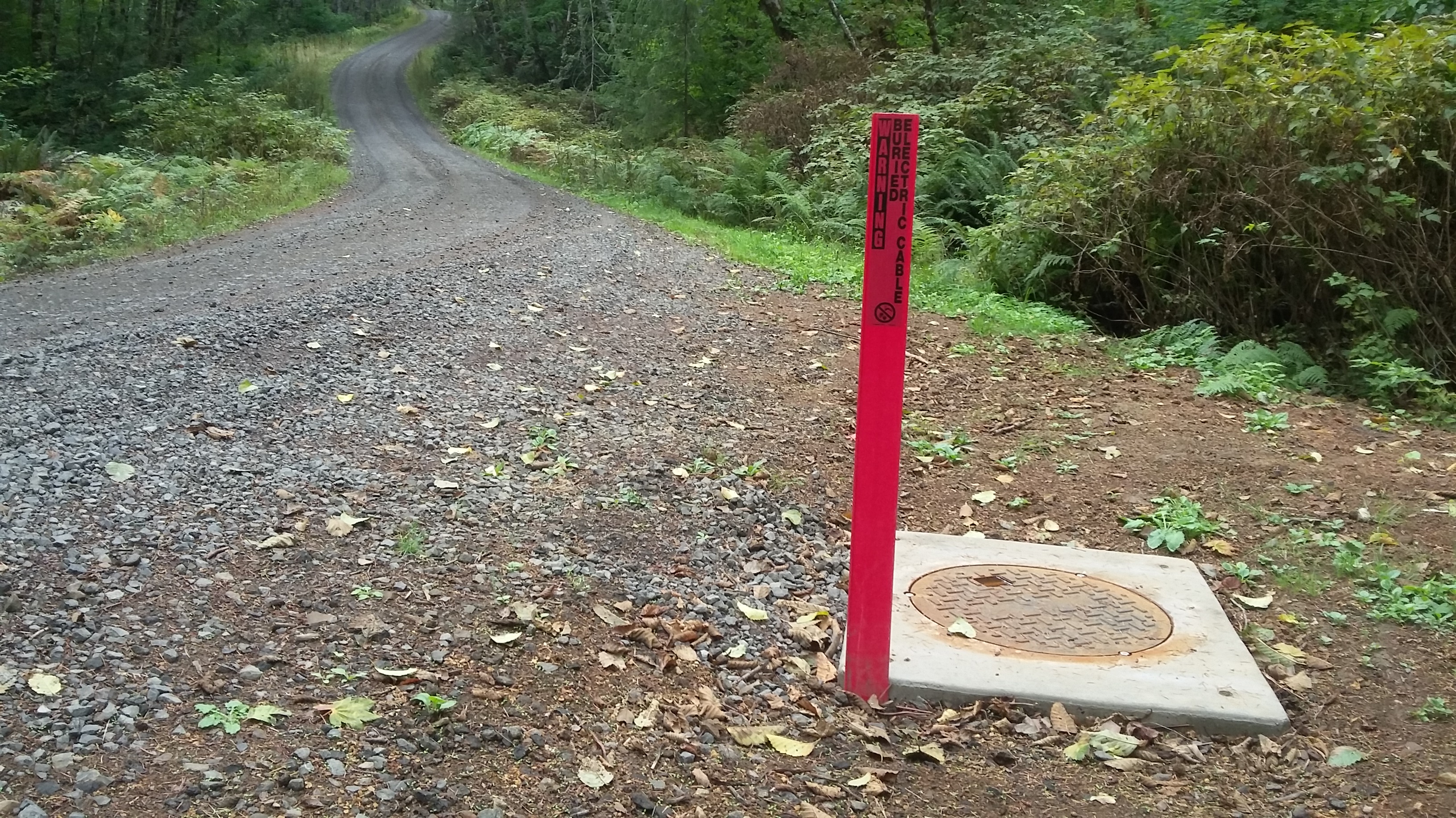 After crossing a bridge, you'll turn right onto NW Cochran Road and go about 3.8 miles to turn left onto Round Top Road (see photo below). Some GPS may have you turn a bit earlier where there is a yellow gate - the proper turn is a bit farther down the road where there's a painted orange arrow and a yellow sign on a tree labeling it Round Top Road. Note that there are red markers for underground power lines (pictured below) all the way to the summit - if you see these, you are on the right road.