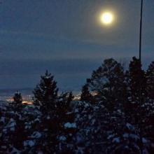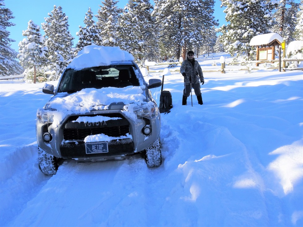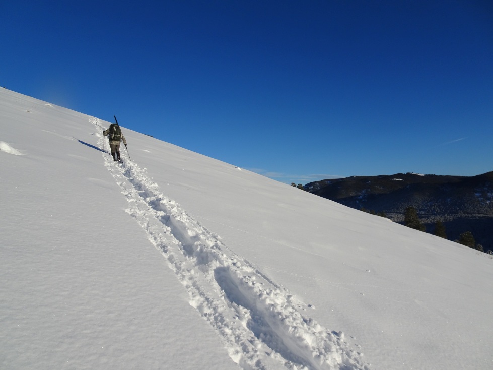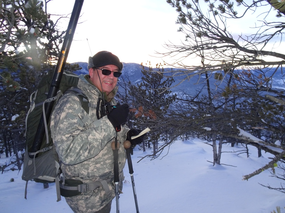 We chose one of the easier Helena-area summits (W7M/CL-161) – but still found it to be a winter challenge. The first challenge was getting into the parking lot – it took about 30 tries & several times of being hi-centered in the snow to blaze a path into the parking lot to find a parking spot that didn’t block the road. We got started with the hike at 3:00 (about 30-minutes late), and the hike up (30-minutes in the summer) took us 2-hours on snowshoes. Bill & I alternated breaking trail – which worked out great. The temperature was nice – it was -8°F in Helena, but likely a bit warmer up where we were.