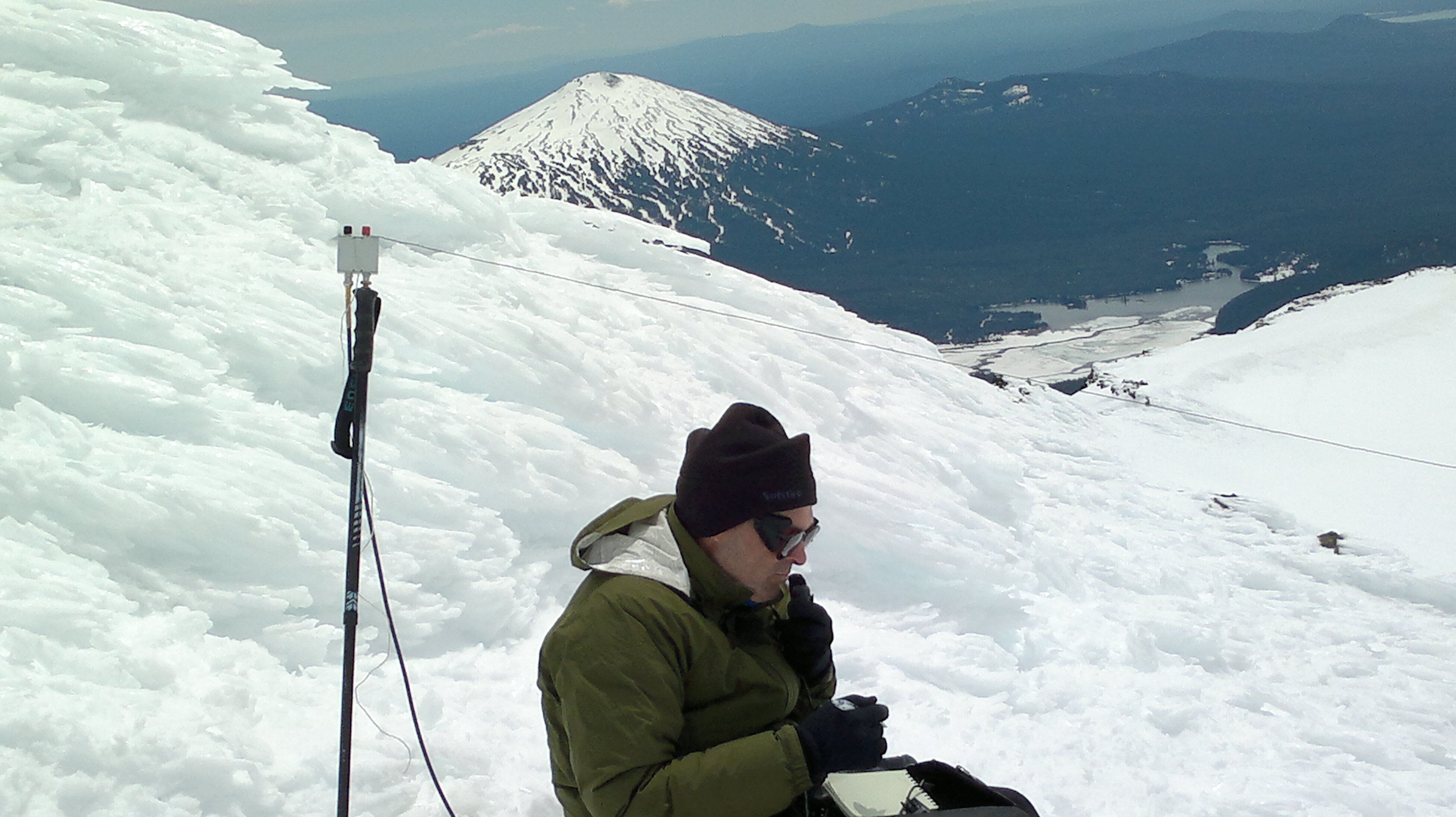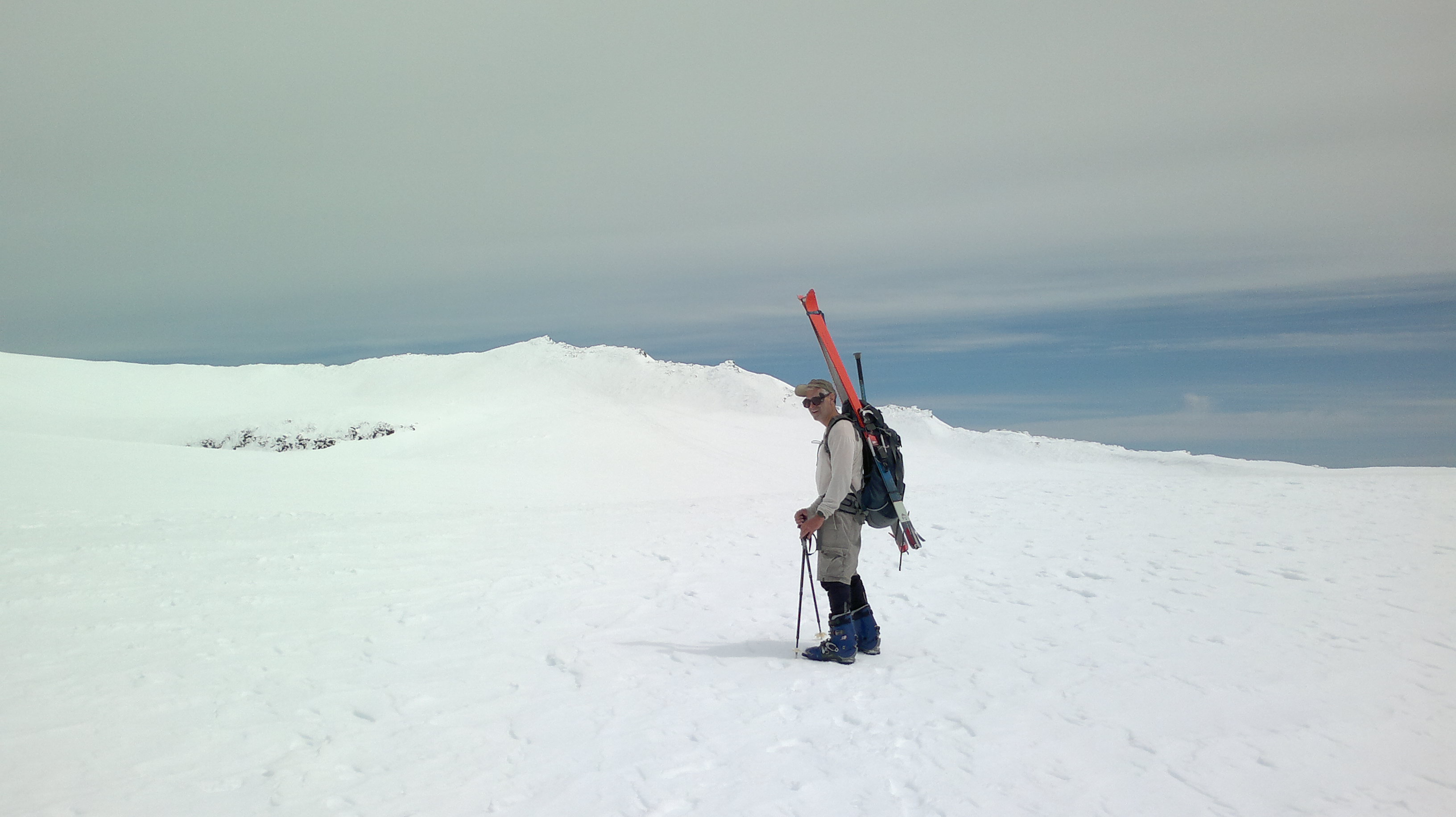 We started on skis right away, following a highly variable set of bootprints in the snow up Hell's Creek drainage. On coming out on the plain between this drainage and the mountain we were greeted with sunshine, blue sky, and a great view of the mountain. For the most part we skinned up (a napped fabric on the ski base allowing climbing) until about 9,200 feet when things get steeper and we started kicking steps and carrying skis. As I had occasional coverage from T-Mobile (signals from Mount Bachelor) I periodically was able to update my alert with current elevation and timestamps in a poor-man's version of APRS.