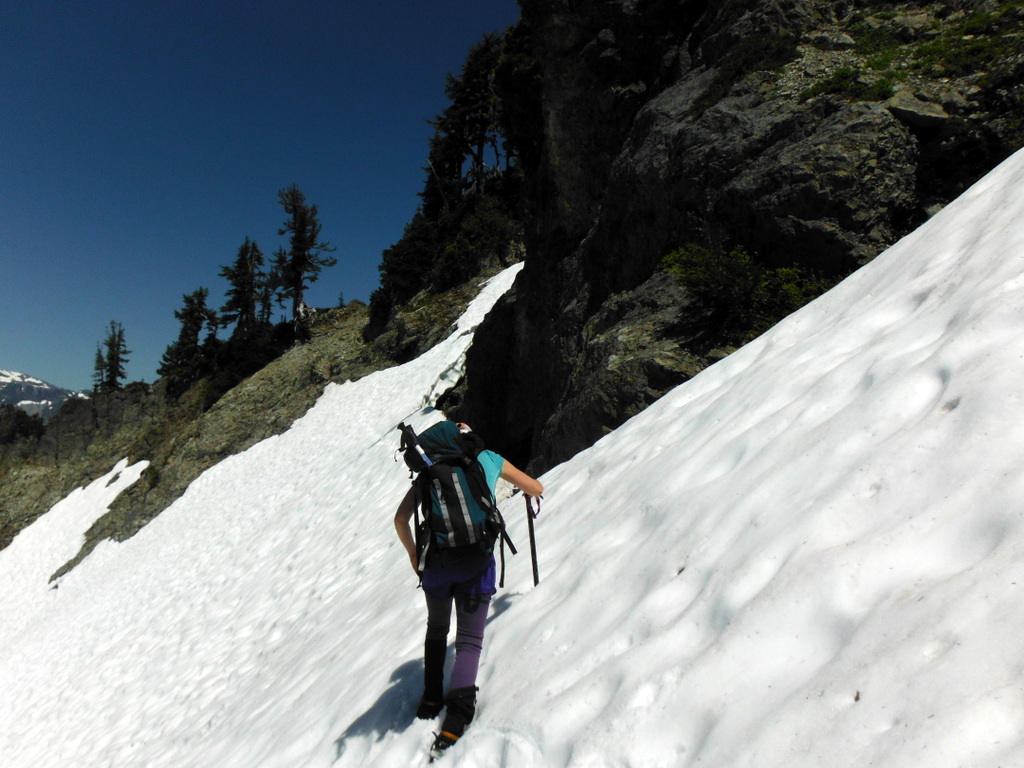 We found very little information on access to Stevens Peak. You can start by ascending to Unicorn Peak and then drop down on high angle snow and traverse perhaps a half mile to the Boundary Peak/Stevens Peak Saddle. From here the topo maps and images may suggest that the route is to simply ascend the summit ridge about one mile. However, there are two gendarmes blocking the way. We found a way on climbers left via a high angle snow traverse around these gendarmes. It took almost three hours to make the 1.5 mile traverse from Unicorn to Stevens.