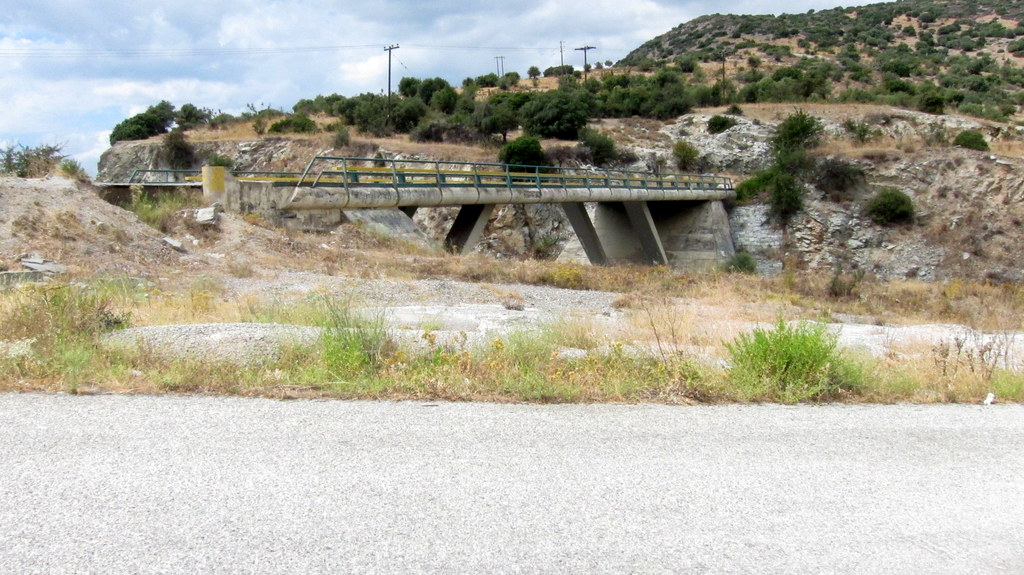 Starting from Nea Anchialos heading east towards Volos on Highway 30, watch for the overpass with the "Entering Volos" sign. There is a sharp right turn just after this overpass that will take you up and over the highway. From Volos, head west on Highway 30 to the overpass. The overpass is near 39.302639, 22.913646. The road proceeds uphill to the northwest from here, with some switchbacks and turns.