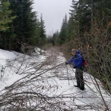 We were successful following the directions of our GPS to take us right to the gate. Head about 15 miles on Highway 224 east of Estacada to Fish Creek Rd. (Note that you DO NOT get to Fish Creek Mountain W7O/WV-015, via Fish Creek Rd.) You'll cross a bridge and travel along Fish Creek for about 1.8 miles and then the road (FS 5410 and FS 5411) heads uphill for 8 miles to a large landing where four roads meet. From here it's about 2.1 miles to a gate where you can park - however, in late April we found several feet of snow on the road and walked that distance. For your nicer vehicles, you may find the road a bit narrow in places, so walking before you get to the gate may be a good choice. From the gate the summit proper is about 0.7 miles - we found it quite overgrown, although it might eventually be cleared so that the RF site at the top can be maintained. We've not experienced any QRM issues from this site.