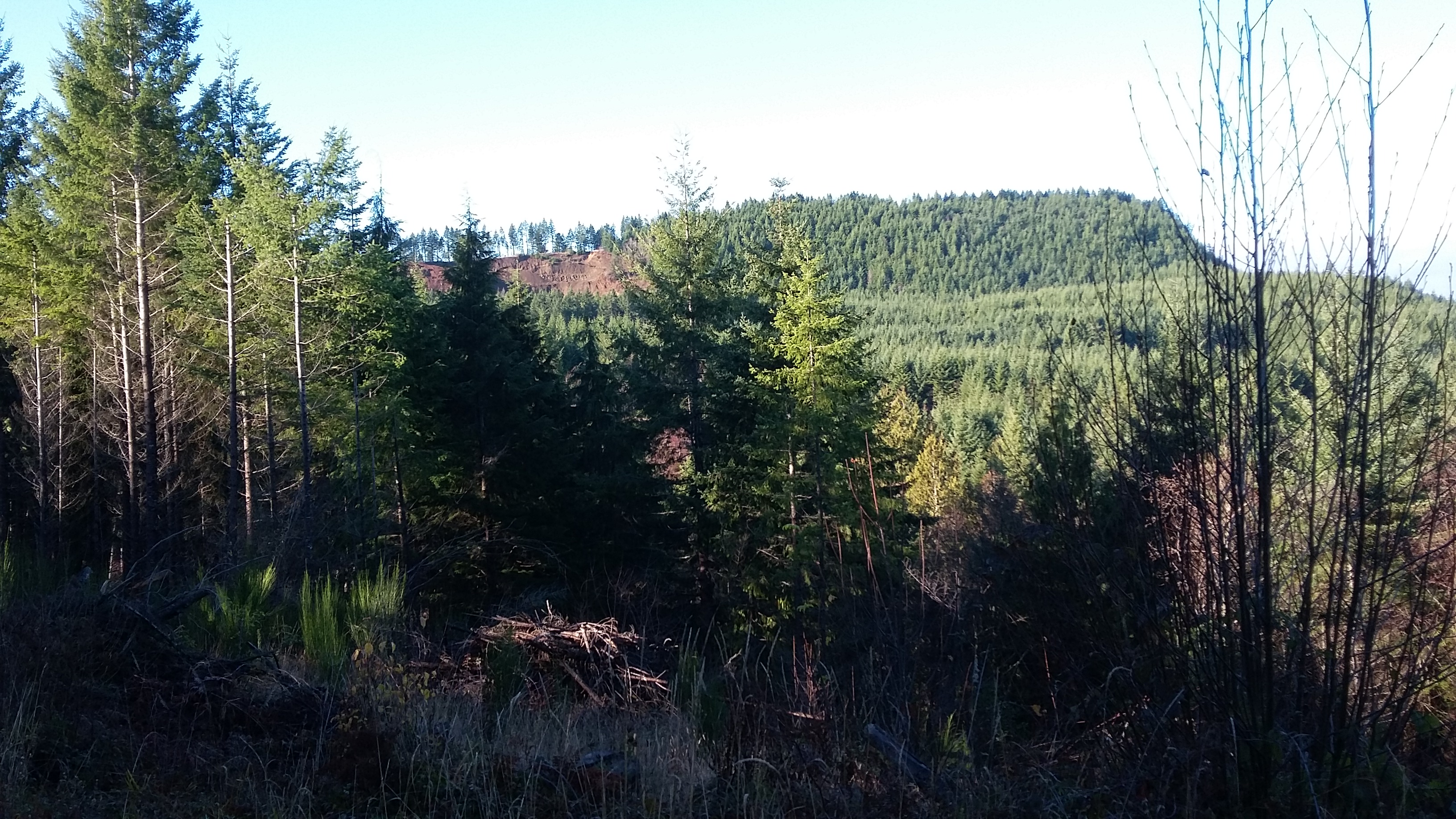 You'll arrive at the top of this steep road at a landing above the quarry - this is just within the Activation Zone and is a fine place to stop. However, for those that like to get the actual summit, it's less than 1/10 of a mile farther - continue up, following the flagging tape up the ridge on an abandoned road through Oregon Grape. There are many trees and it's a bit challenging to put up antennas and there are no views or sunshine, but you'll be at the top.