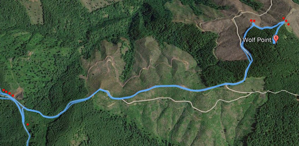 Head west from Portland on Highway 26 and exit to Highway 6 towards Tillamook. About four miles past the Tillamook Forestry Center and just past milepost 18 you'll turn north onto Cedar Butte Road. There are good signs from here for the Cedar Butte Trailhead that will lead you in the right direction toward Cedar Butte (four dots on map is where road continues towards Cedar Butte) as well as the turn for Wolf Point (one red dot on map).