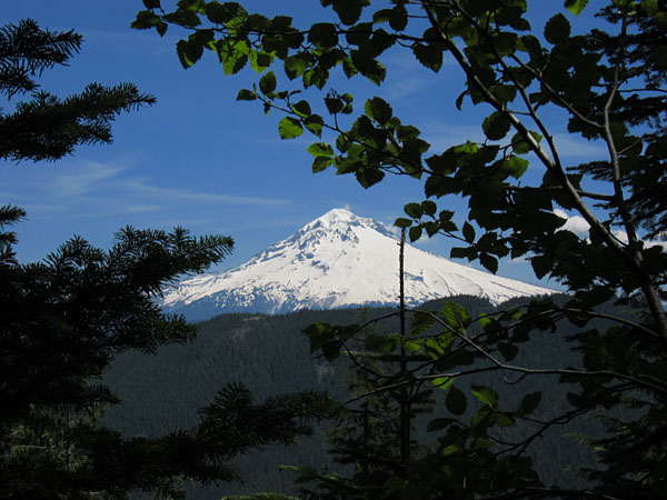 Once past the sign you'll be looking for a slight fork to the left (not the sharp left turn that's before it), take that and continue up and along the ridge. You'll start to get peeks of Mt. Hood on your left along this route. Once you can fully see Mt. Hood through the trees keep your eyes open for the trail up to the top that will be on your right. It's taped, and the cut trail is fairly obvious. The climb up to the top was the only challenging part of the hike. There was some snow and Rhododendron growth over the path making the way difficult (bring a machete! :) ). It's a quick climb, .1 mile, to the top though, so don't let that deter you.