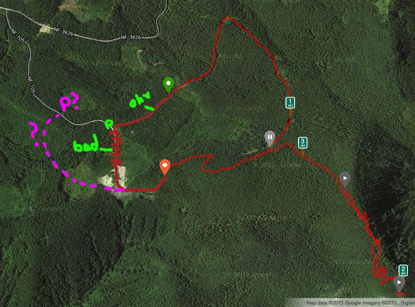 The recommended route is 26 to Sandy, a few miles past Sandy take a right on SE Firwood Rd, continue South on SE Firwood Rd. and take a left onto SE Wildcat Mountain Drive. Continue on SE Wildcat which turns into NF-36 and then NF-3626. You'll take a right on NF-105 and follow that until it ends in a heavily signed "no shooting" gravel pit (the green P on the map). On the Google map it looks like you can continue on 105 until the huge gravel pit at the end of the road - this road has been heavily decommissioned by the forest service and is impassable (it's not a pleasant hike over either, see below).
