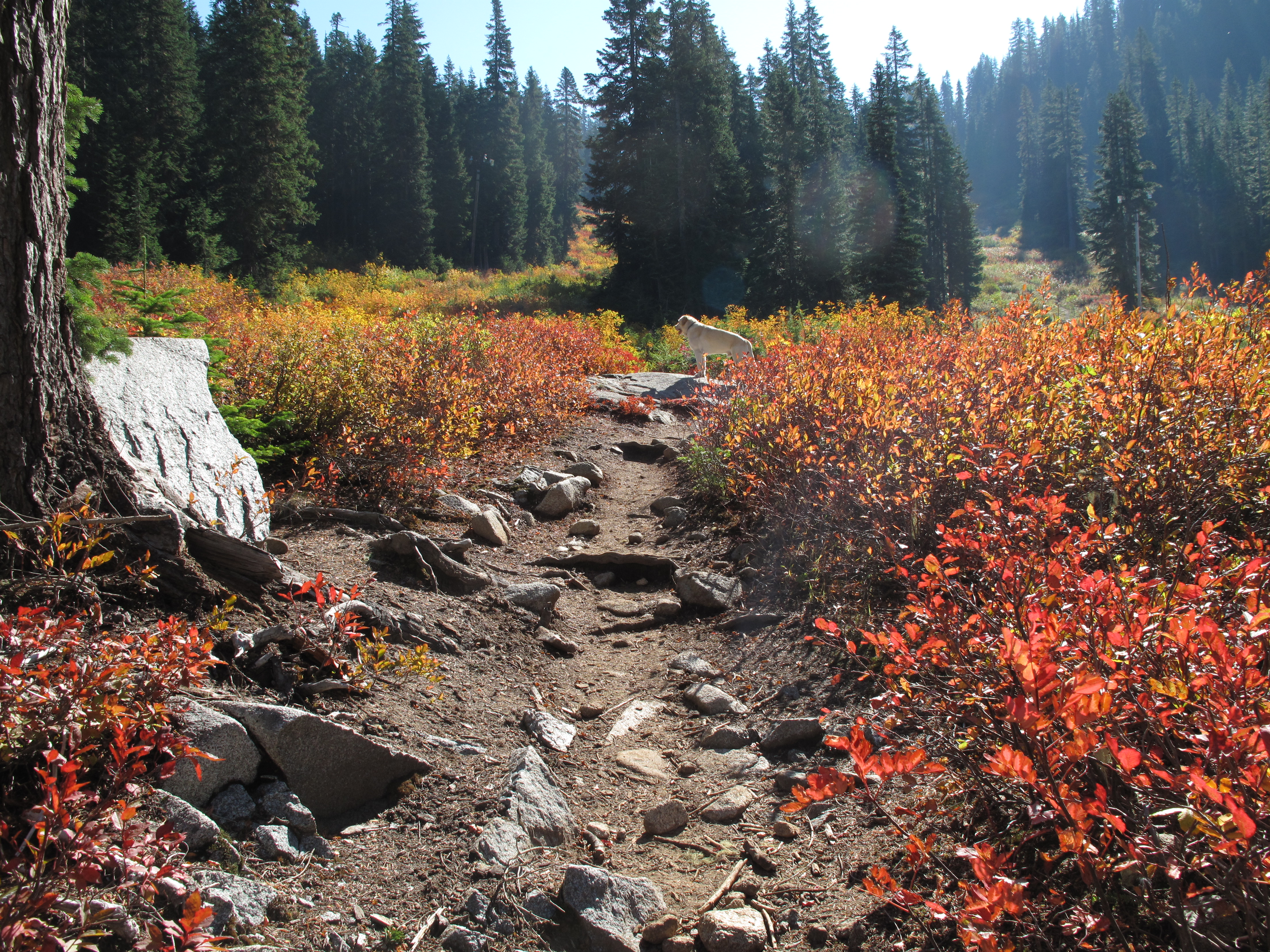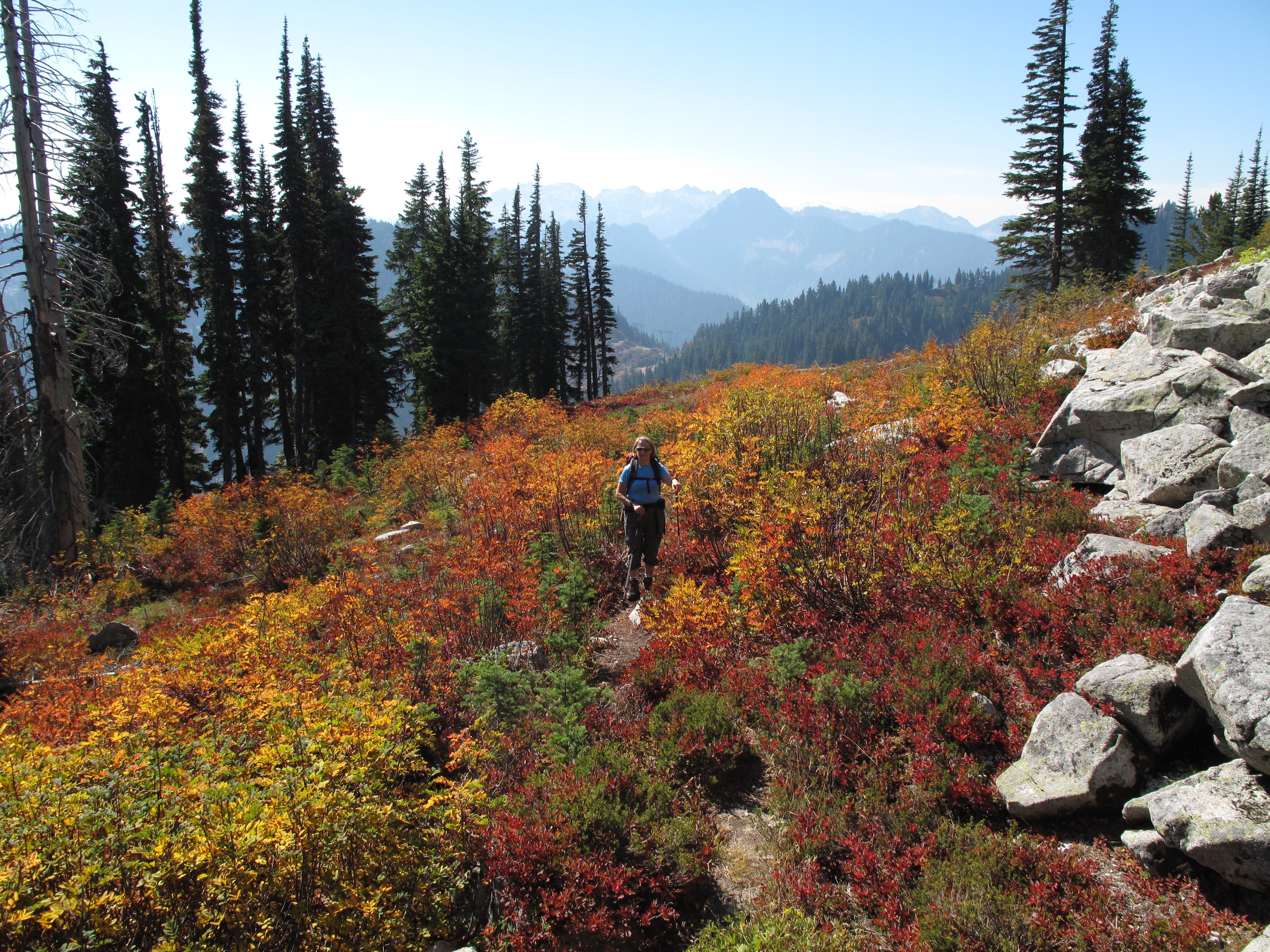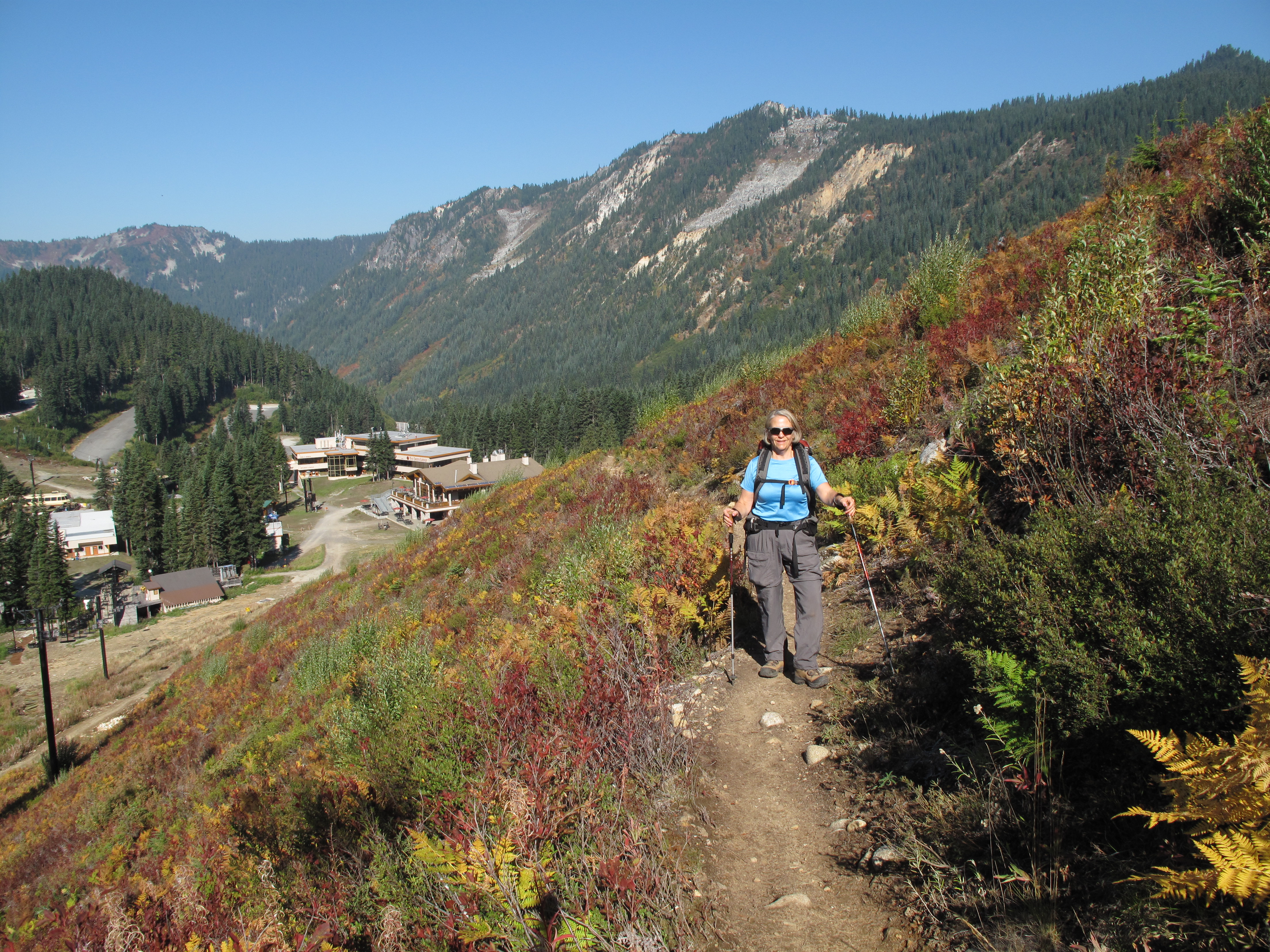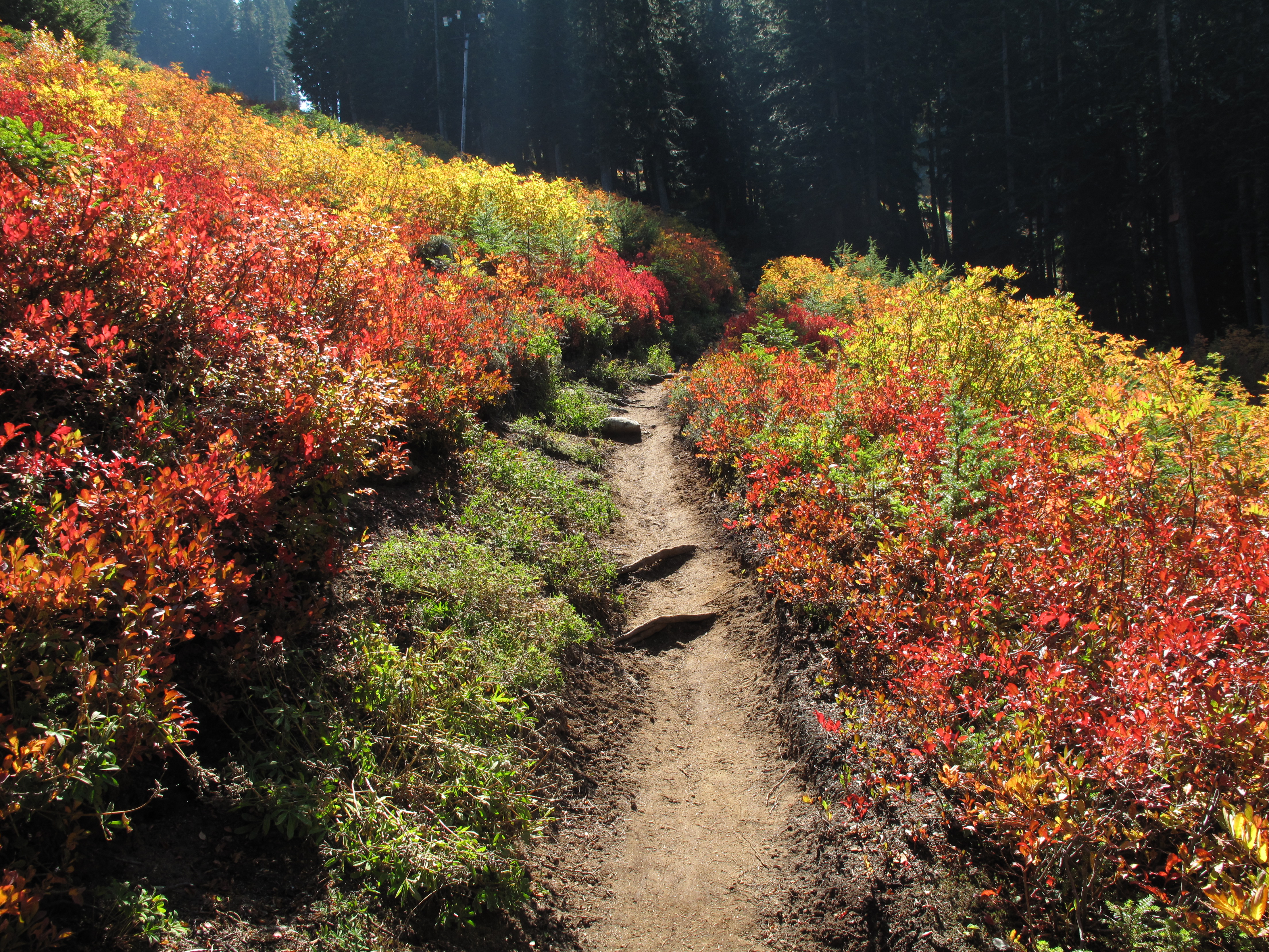 The trail access starts on the Pacific Crest Trail section Southbound from Stevens Pass to Snoqualmie Pass, and so affords an opportunity to meet and speak with Through Hikers doing the entire PCT, especially in the late Summer / early Fall. The route begins by travelling on the well graded PCT, South from Stevens Pass. The TH is found in a large gravel parking area east of all of the main lodges at the ski resort. The actual TH sign is about 100 lineal feet above the gravel parking area. See picture of TH sign. Travel about 2 miles on the well graded PCT, at first through the more visible portions of the ski area, and then through very pleasant and wonderfully colorful (Fall) forest. On occasion passing under the Big Chief chair (old name) and later the Tye Mill Chair of the ski resort.