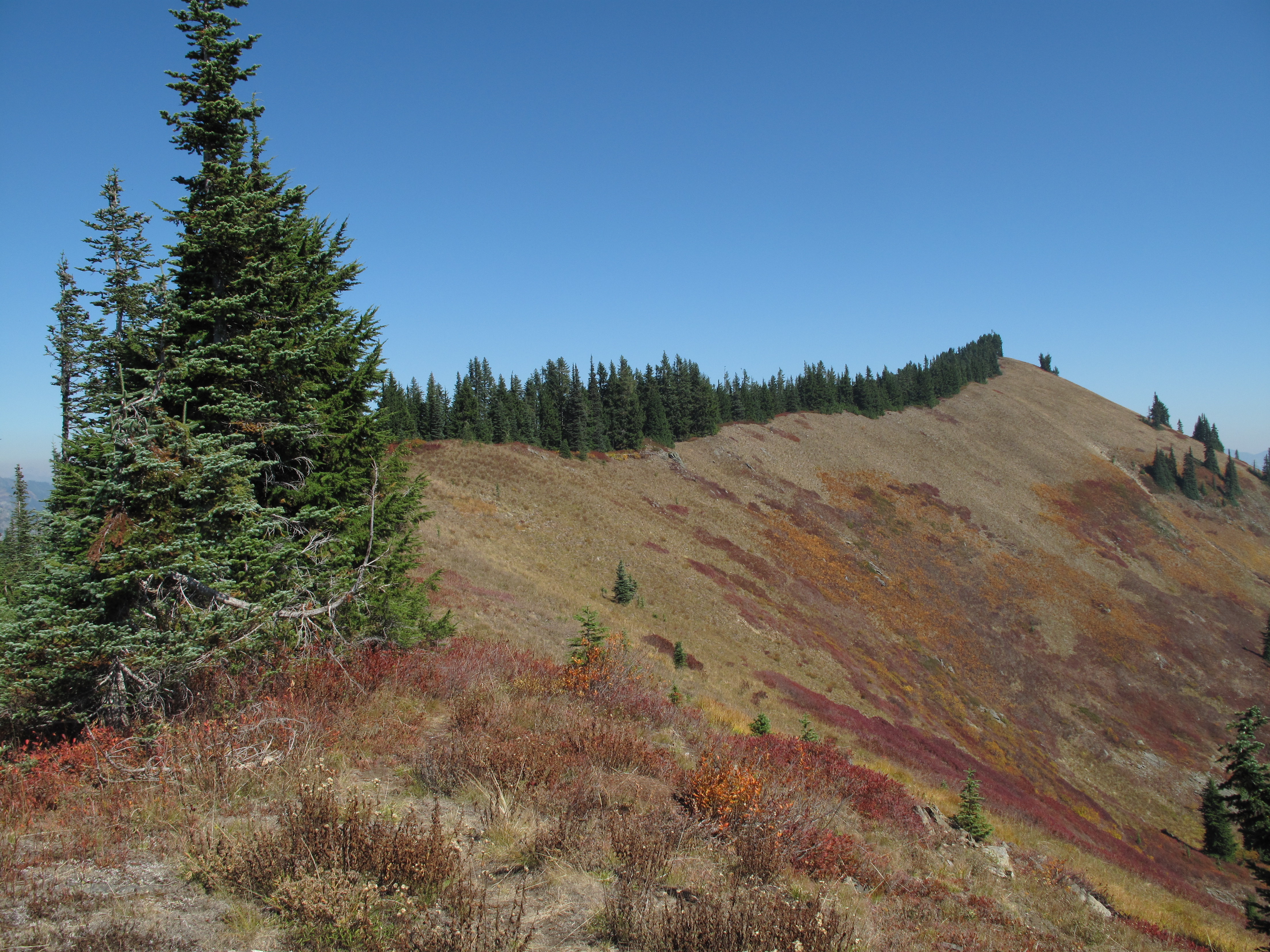 At 5,858 feet, Big Chief Mountain is not tremendously high, but having over 2,800 feet drop looking NE to Mill Creek valley and over 2,400 feet drop looking North to Nason Creek valley from the summit, one feels like one is in a small airplane flying over the Central Cascades. The total elevation gain is approximately 2,000 feet, including some short up and down sections over small "false summits". The approximate total RT distance is between 6.5 and 7 miles.