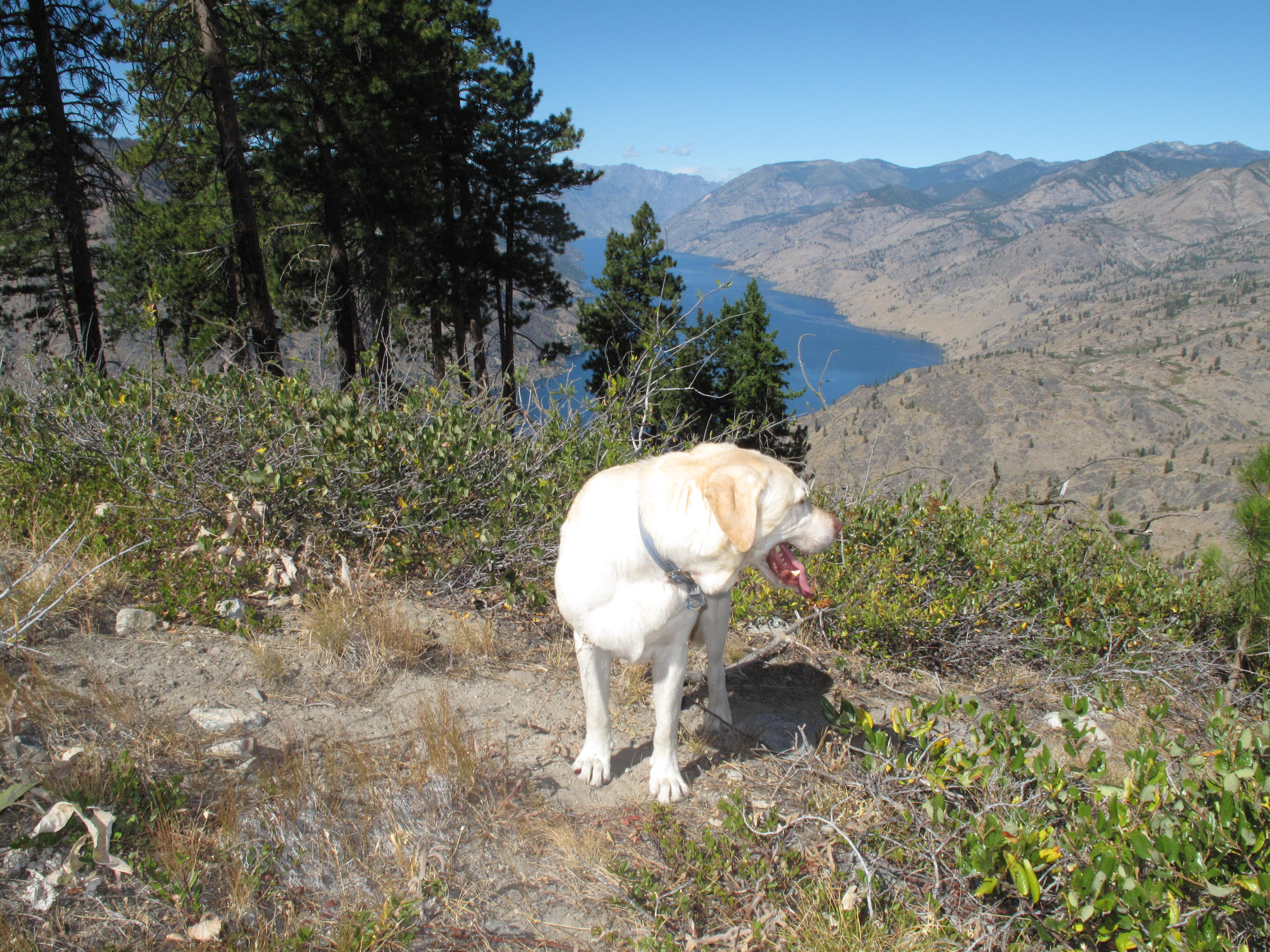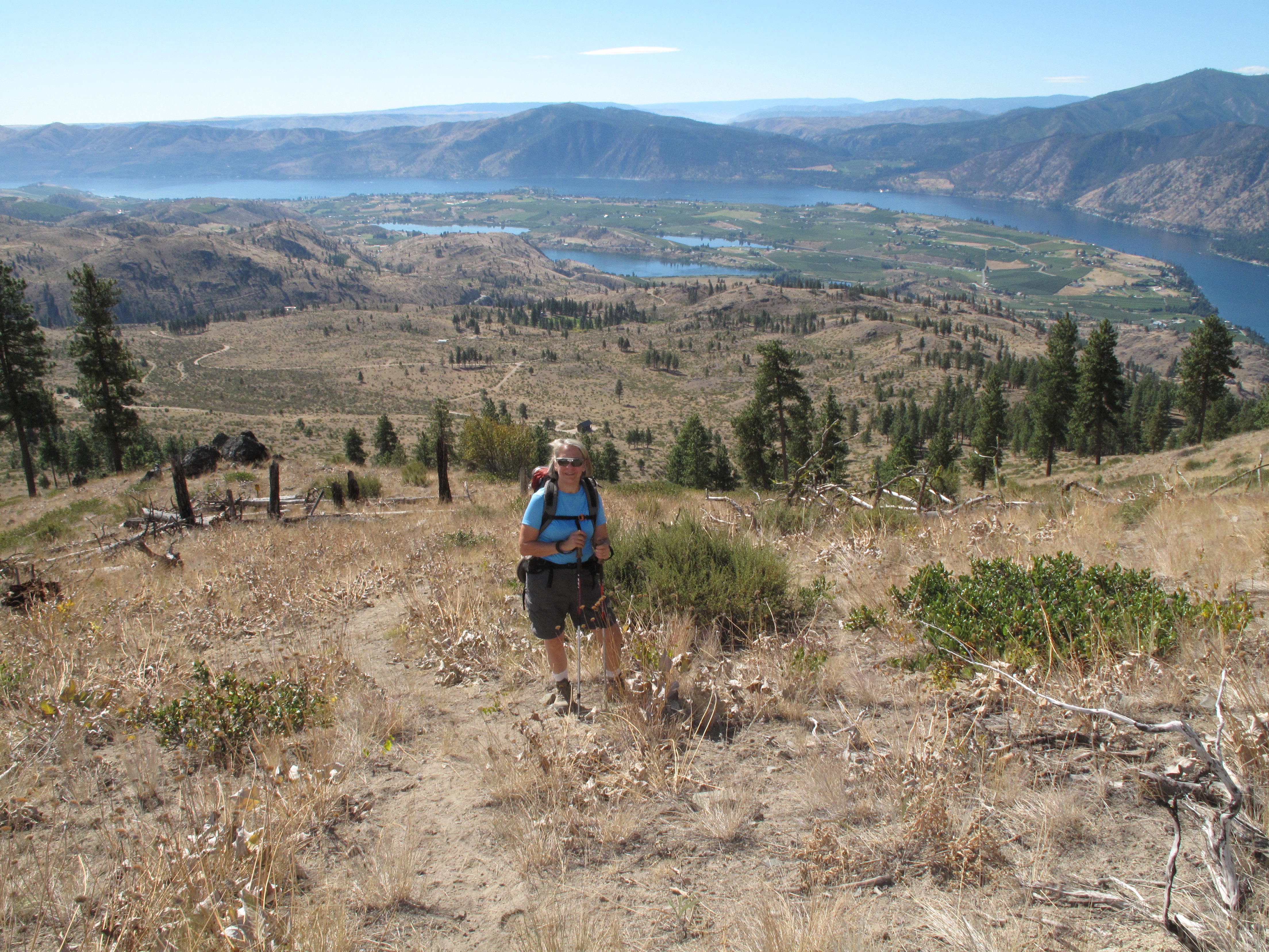 First SOTA Activation of Fourth Of July Mountain, a 4 point SOTA summit above the town of Manson, Washington, was accomplished on Saturday, September 10, 2016.  On a weekend trip to visit with our friends who have a vacation home in Manson, we took some time to Activate this peak.  The overall terrain is quite dry and arid, especially this late in summer.  The trail itself is non-descript, and the redeeming aspect of the activation are the great views from the upper slopes and summit of the mountain.  The weather was quite warm, and we were happy to have gotten a relatively early start.