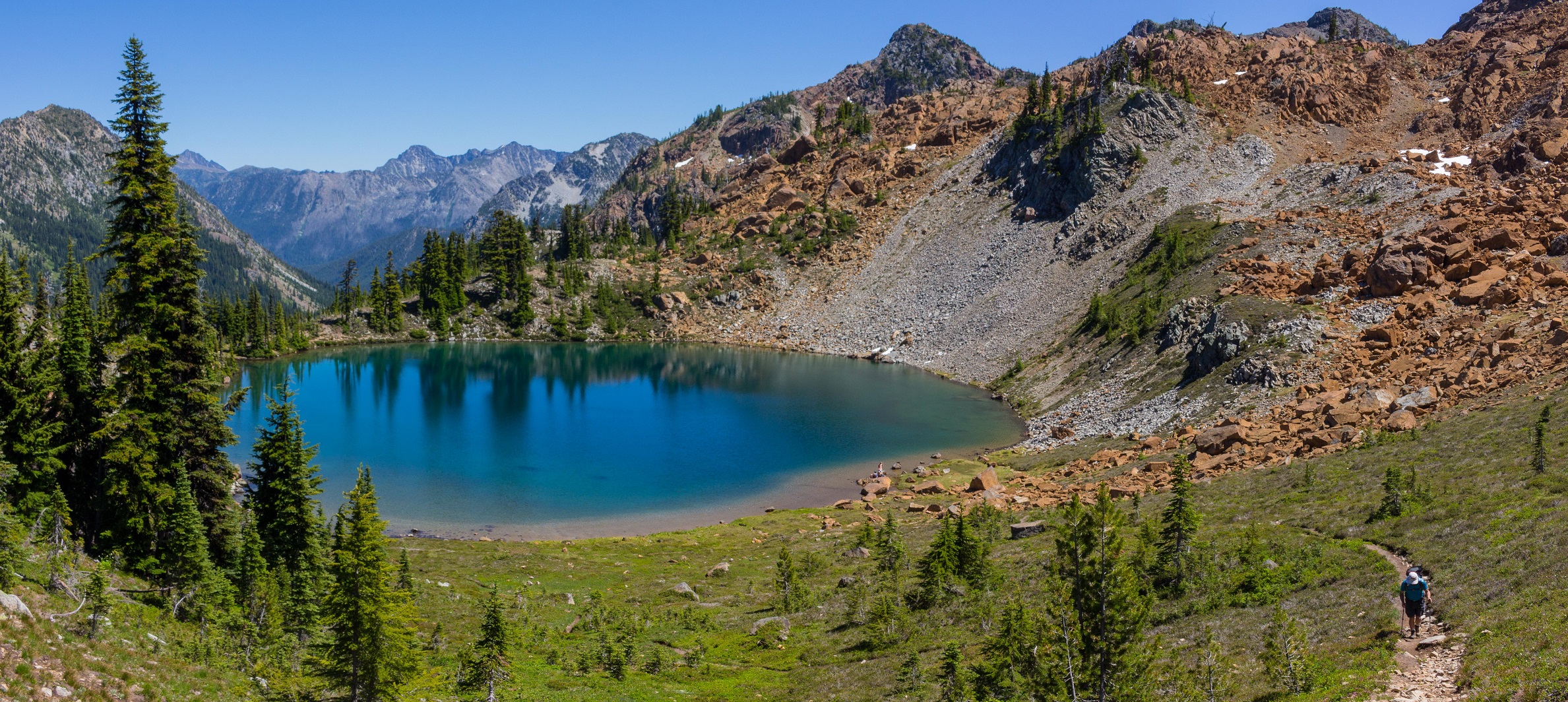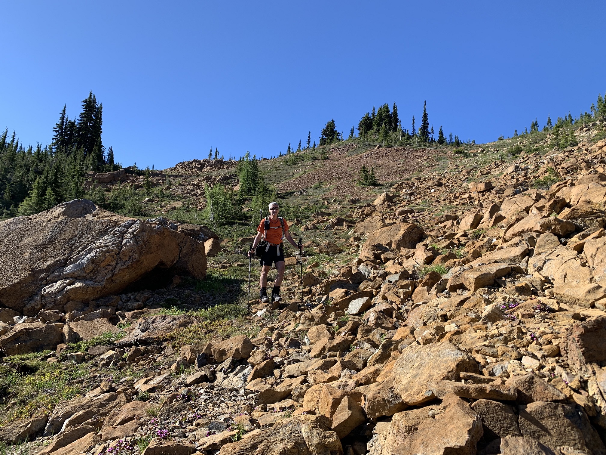 After a successful Activation, with a few S2S contacts, we soaked up the fantastic views, ate lunch and headed down without incident.  This time we took the steep scree slope from the Col that we had bypassed on the way up.  It was not as steep or as loose as it looked from a distance.  We stopped at Sprite Lake to filter water, eat and refresh.  The hike down from Paddy Go Easy Pass was tedious as we were heading down in the afternoon sun, on the relentless switchbacks that lose 2,800 feet to the Cle Elum River Valley, far below.