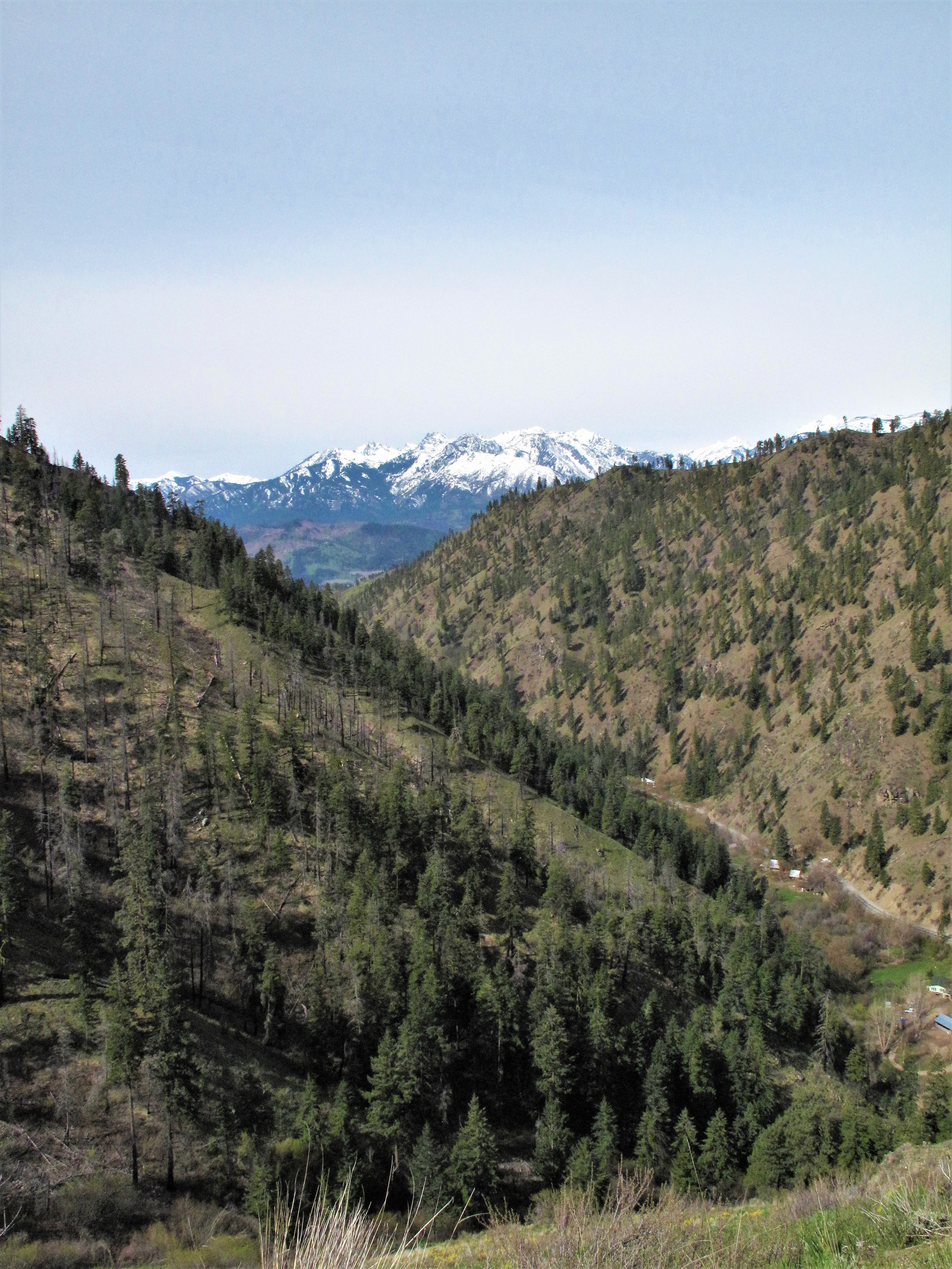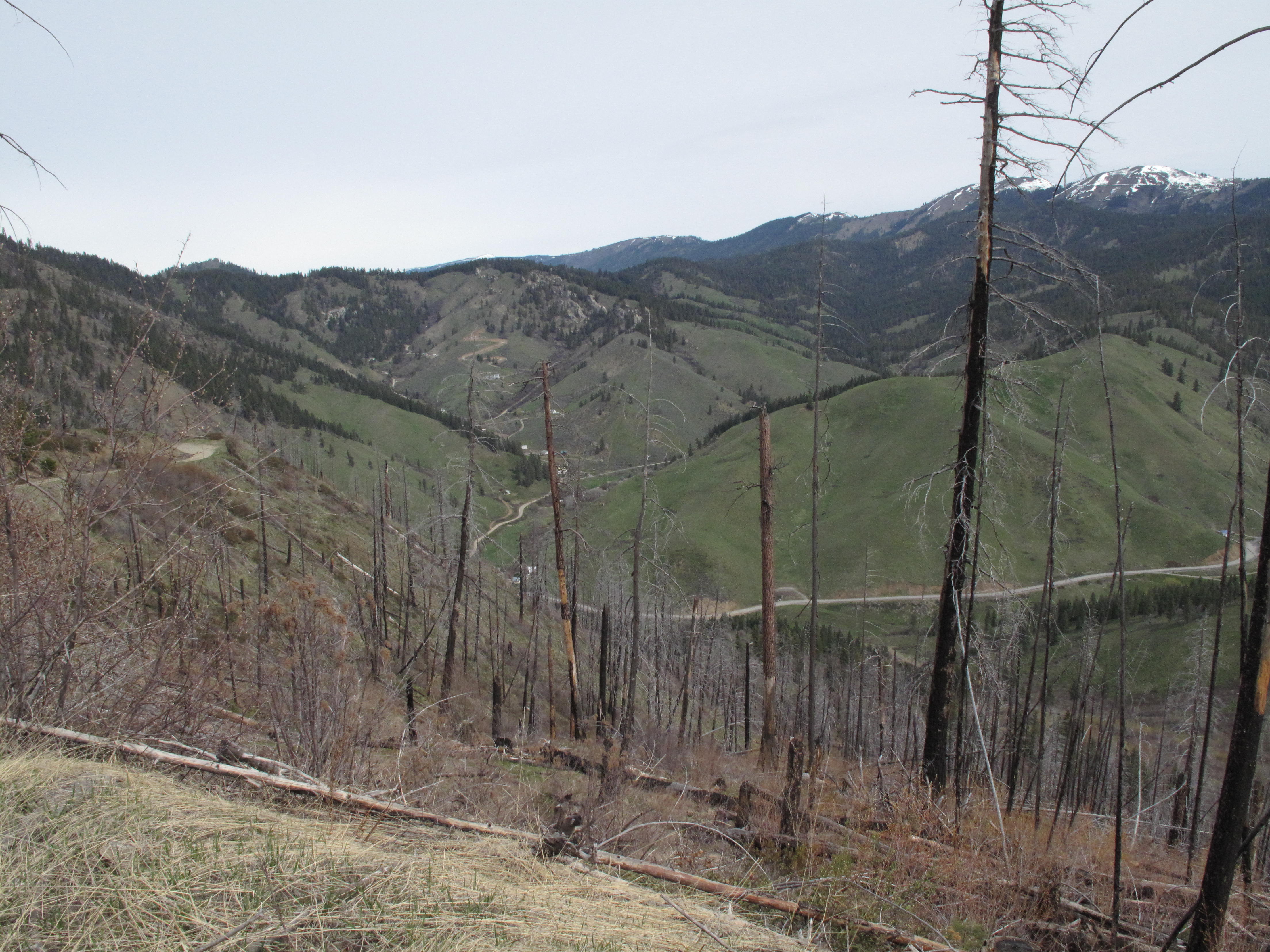 Lower down, the route was not very pretty as it traverses through an area burnet several years back.  As we gained elevation, we rose above the burn areas, and the views of the region became more & more impressive.  Most prominent were the views South, towards the Stuart Range & Enchantments.  The summit of Tibbetts is generally open, and looking down about 2,000 feet to the Wenatchee River Valley, the city of Wenatchee and the Columbia River to the east, and west towards the Leavenworth area.  The Orchards were in full bloom, and lent an aura of shimmering white to portions of the valley below.
