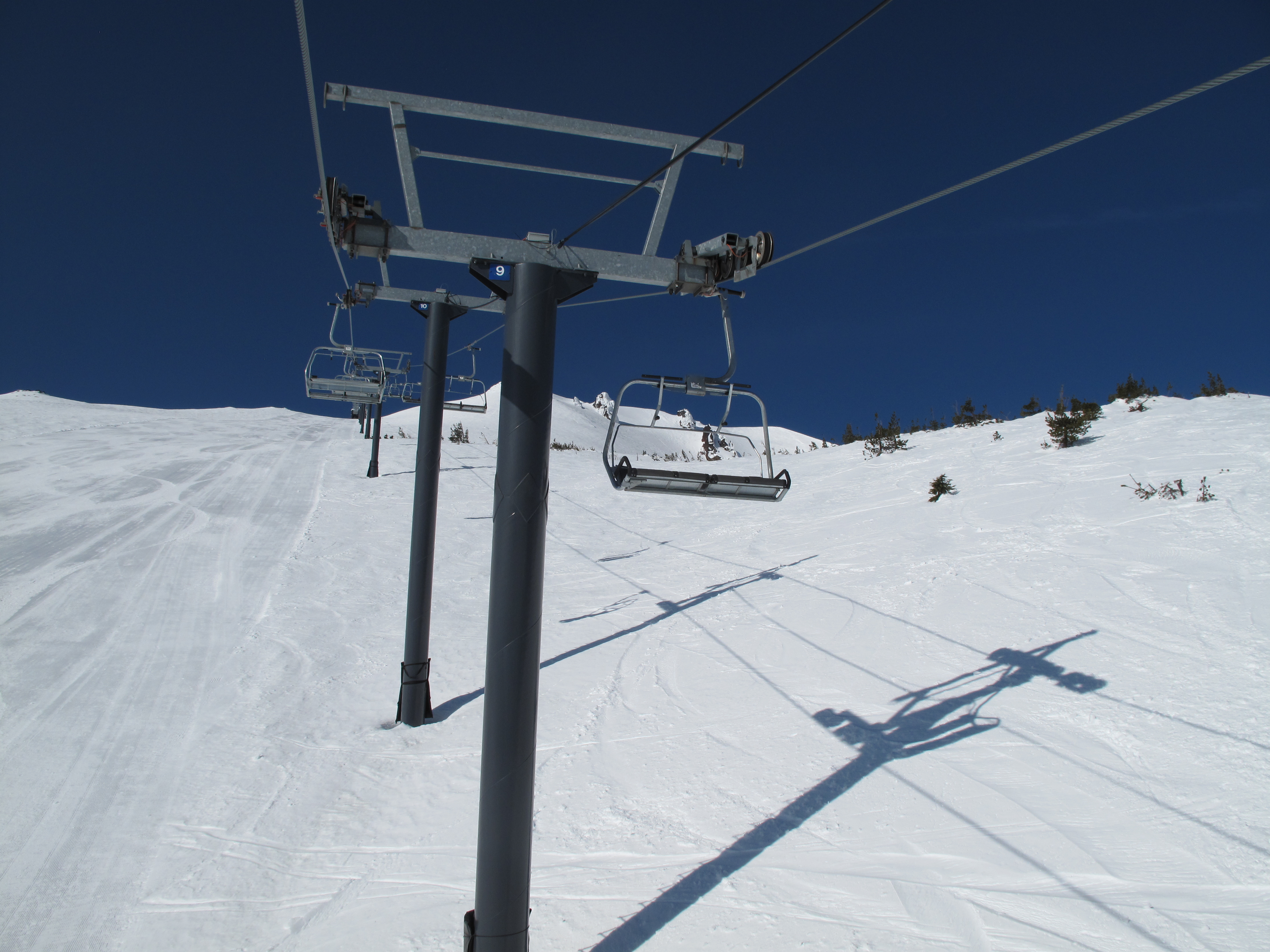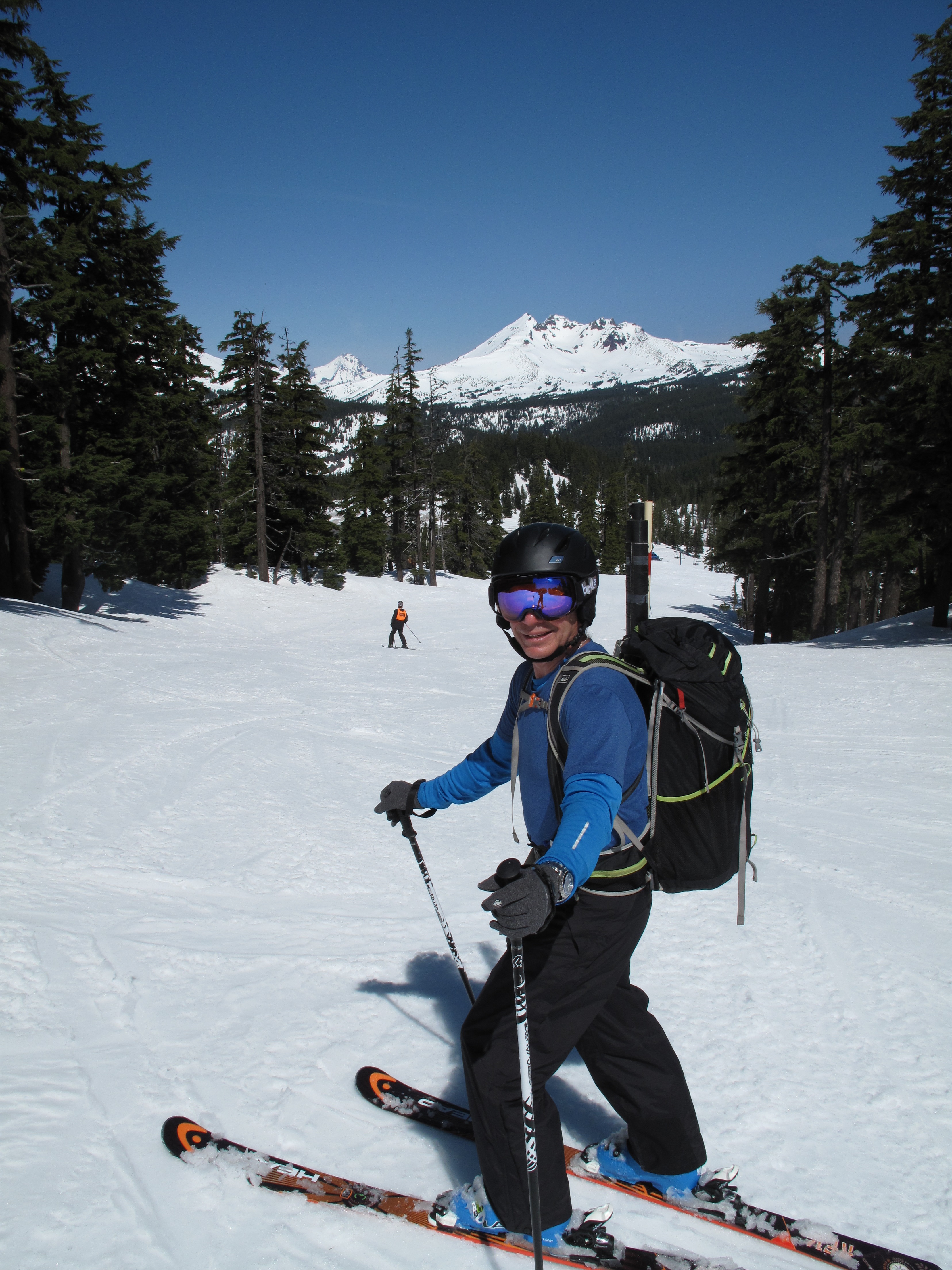 Mount Bachelor, W7O/CM-005, is a 10 point SOTA Summit in Central Oregon, near the city of Bend. Access is relatively easy, any time of year. This is because Mount Bachelor, a Strata Volcano of 9,065 elevation, is also a 58+ year old Alpine Ski Resort. During the Ski Season, it is possible to ride the “Summit Lift” to within ¼ mile and 110 vertical feet of the true summit. Other times of year, after skiing is done, Mount Bachelor can be a pleasant snow hike, or a regular trail from the base facilities at about 6,300 feet elevation. Alternatively, the Summit Lift operates during the summer months, to whisk tourist to the top in minutes. As we had purchased Spring Season Ski Passes, I decided to activate via the summit lift, and ski down. This would give me a 2,765 foot ski run!