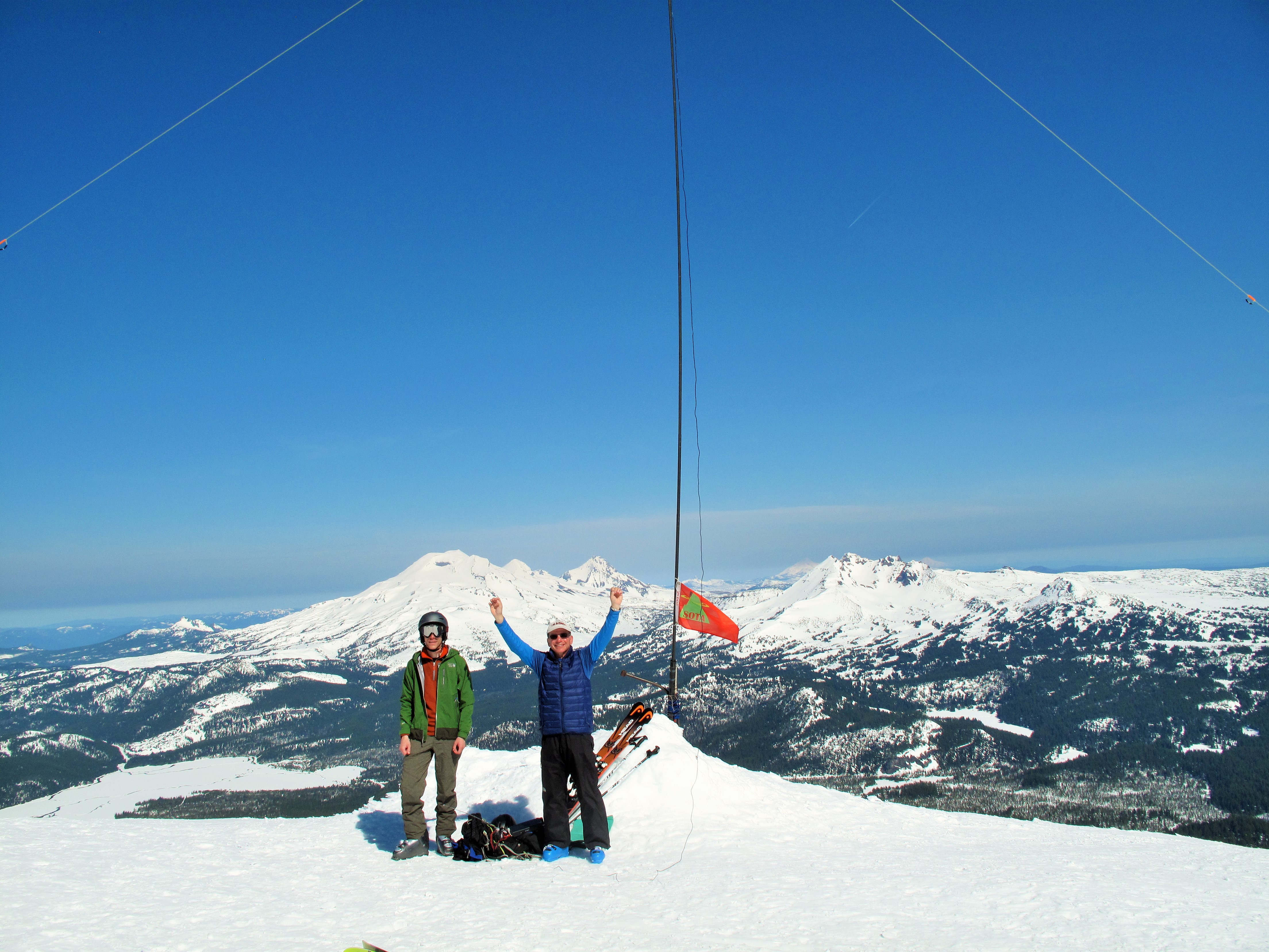 3 X 3 X 3 X 3 X 3 = Three Activations in three days with three, 3X3 (weak signal) contacts, amongst about 50 contacts overall. During an early Spring vacation in the Bend, Oregon area, we enjoyed all that Central Oregon is famous for! Good spring skiing, snowshoeing, hiking, SOTA Activations, and a sampling of several of the more than 80 breweries that exist in the greater Bend area. This report, number 1 of 3, deals with the Activation of Mount Bachelor, 9,065 feet, 2,763 meters.