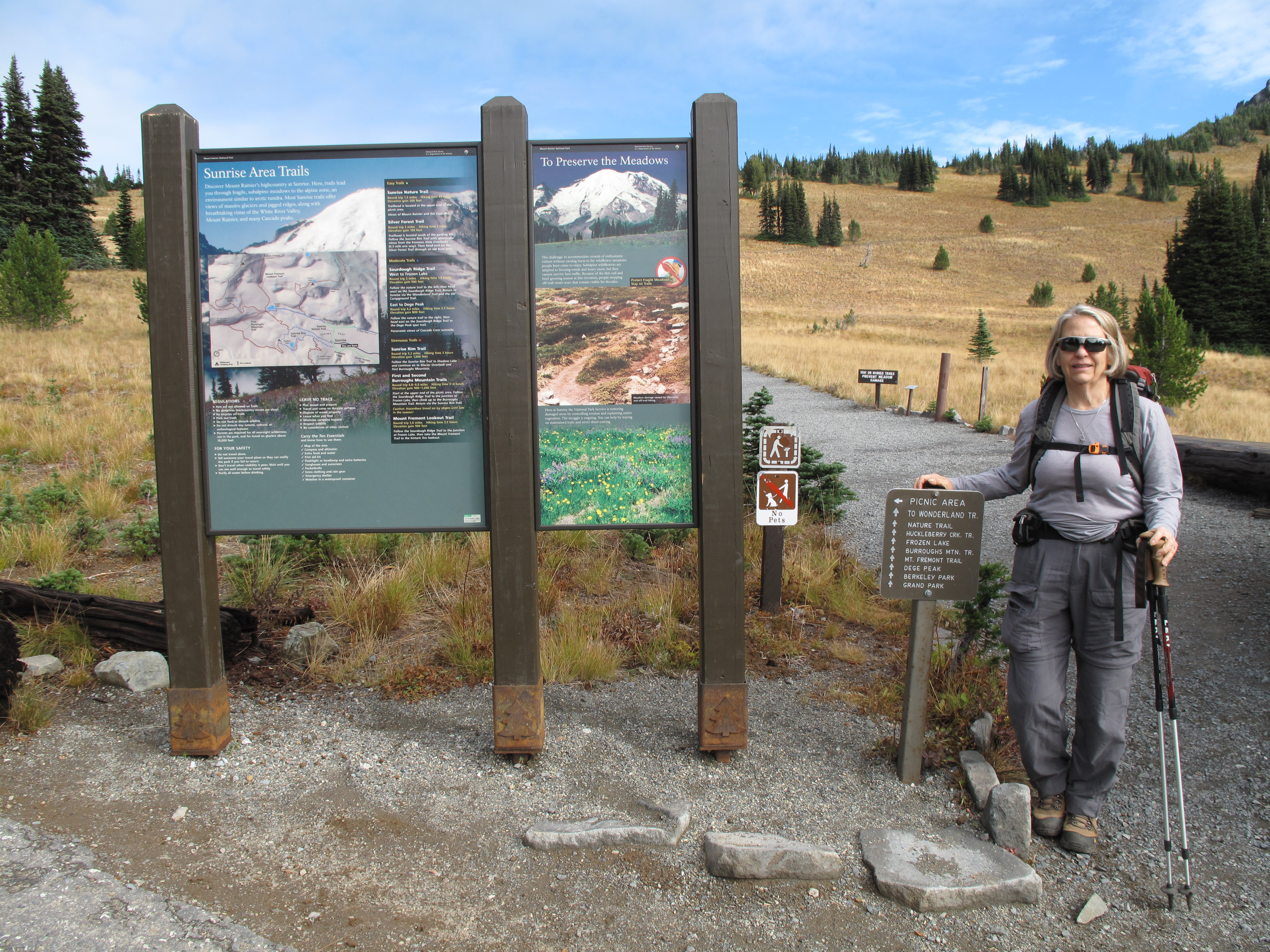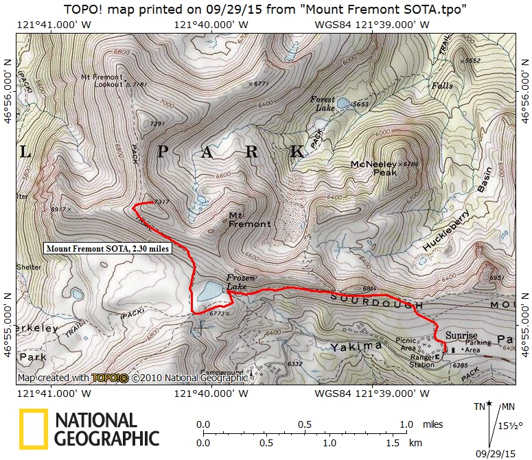 A crisp Fall-like day, sparse crowds and a successful activation made for a pleasant, if short day. The route to the summit, and the Activation itself were changed, and cut short, by a large heard of mountain goats which were straddling the ridge running between the SE Summit (incorrectly labeled as Mount Fremont) and the Middle Summit, (True Summit).