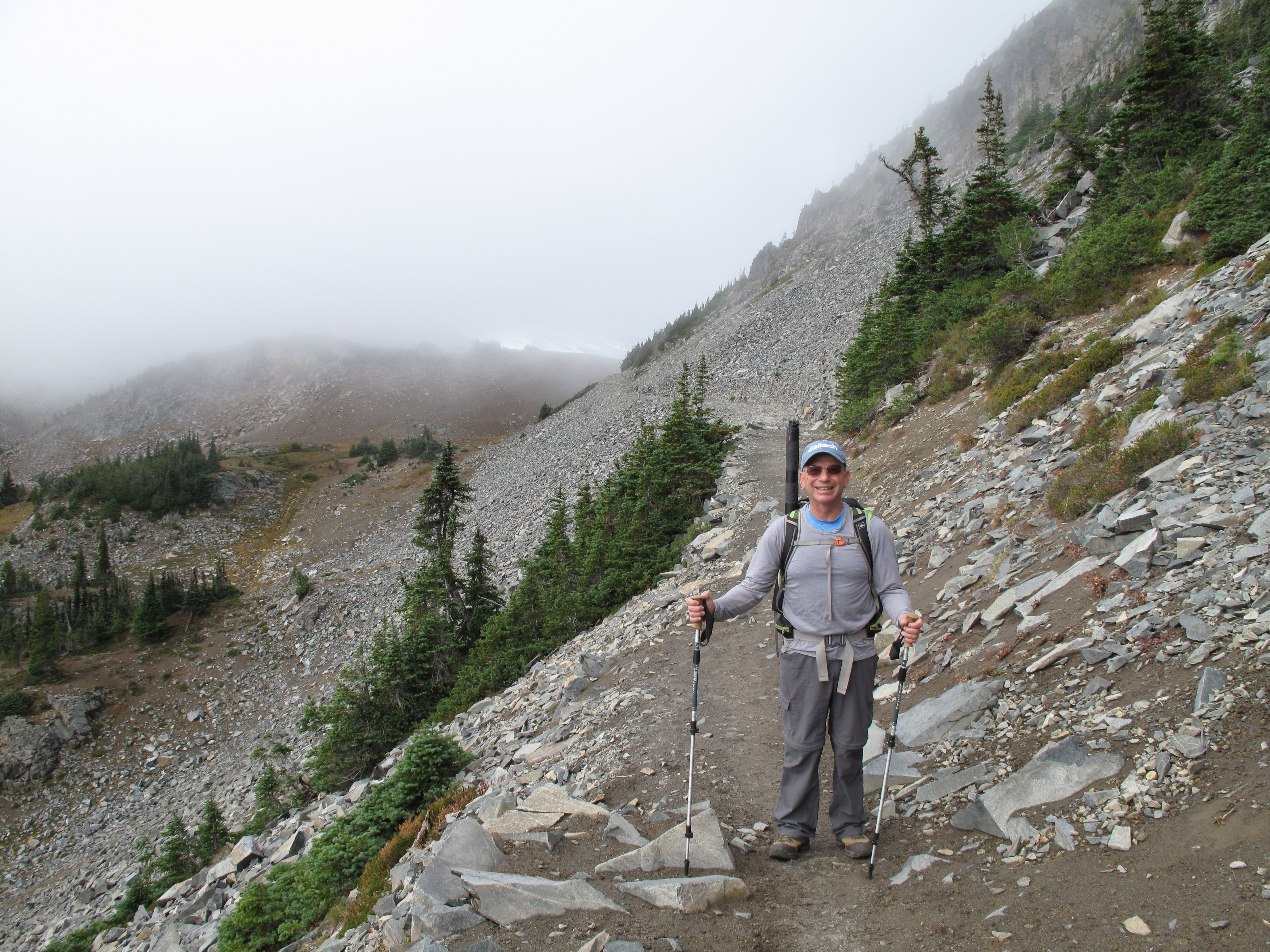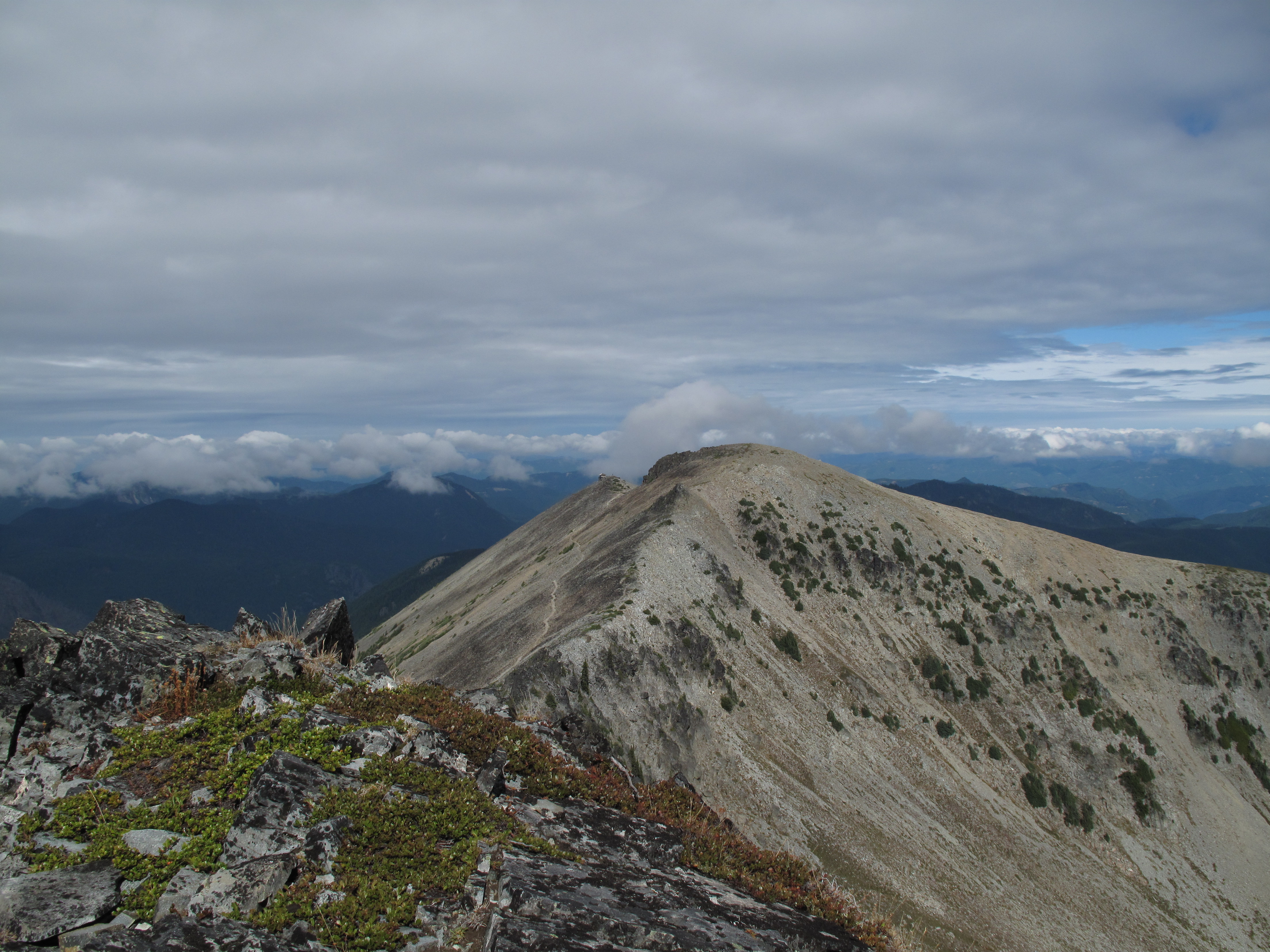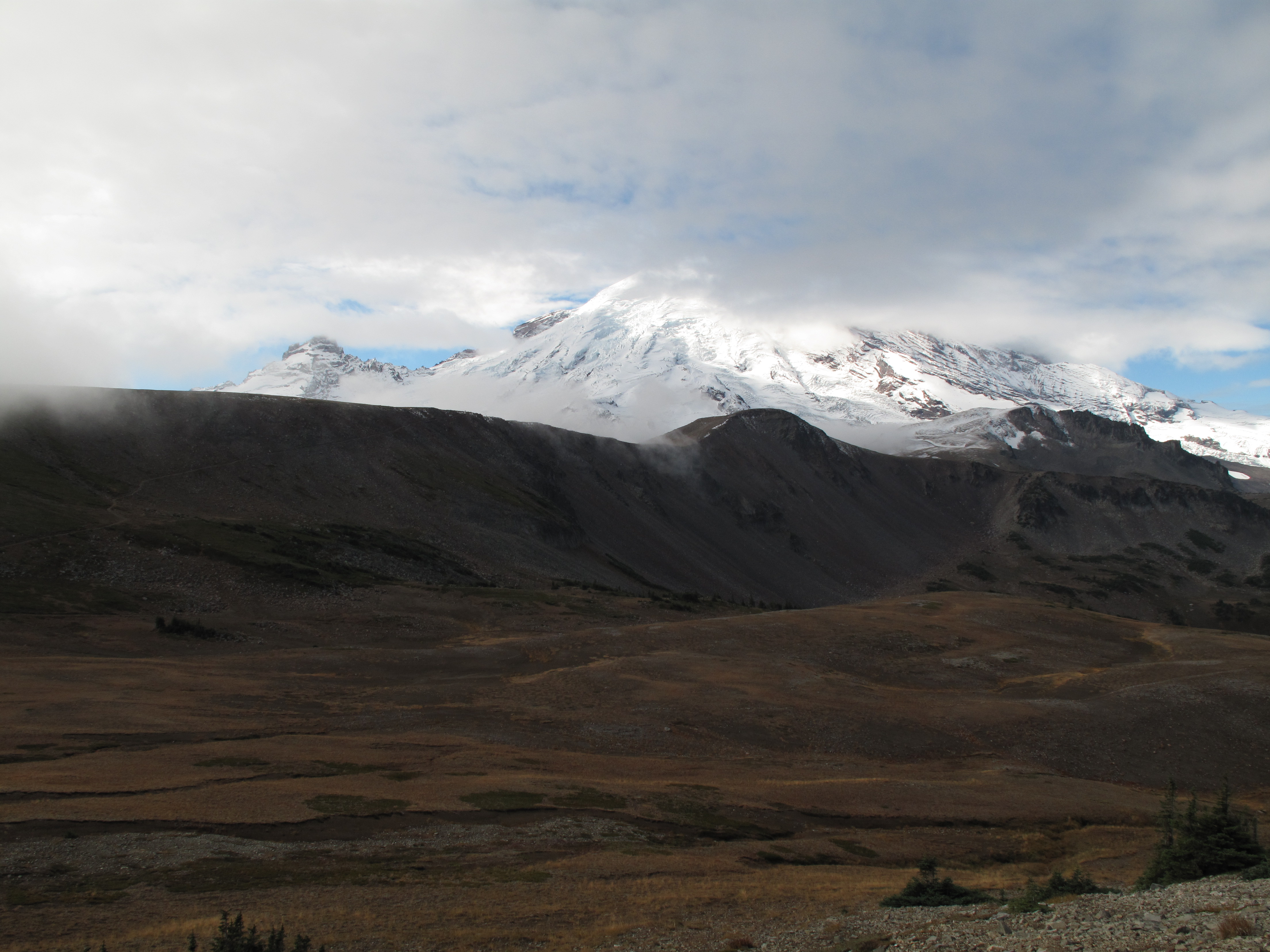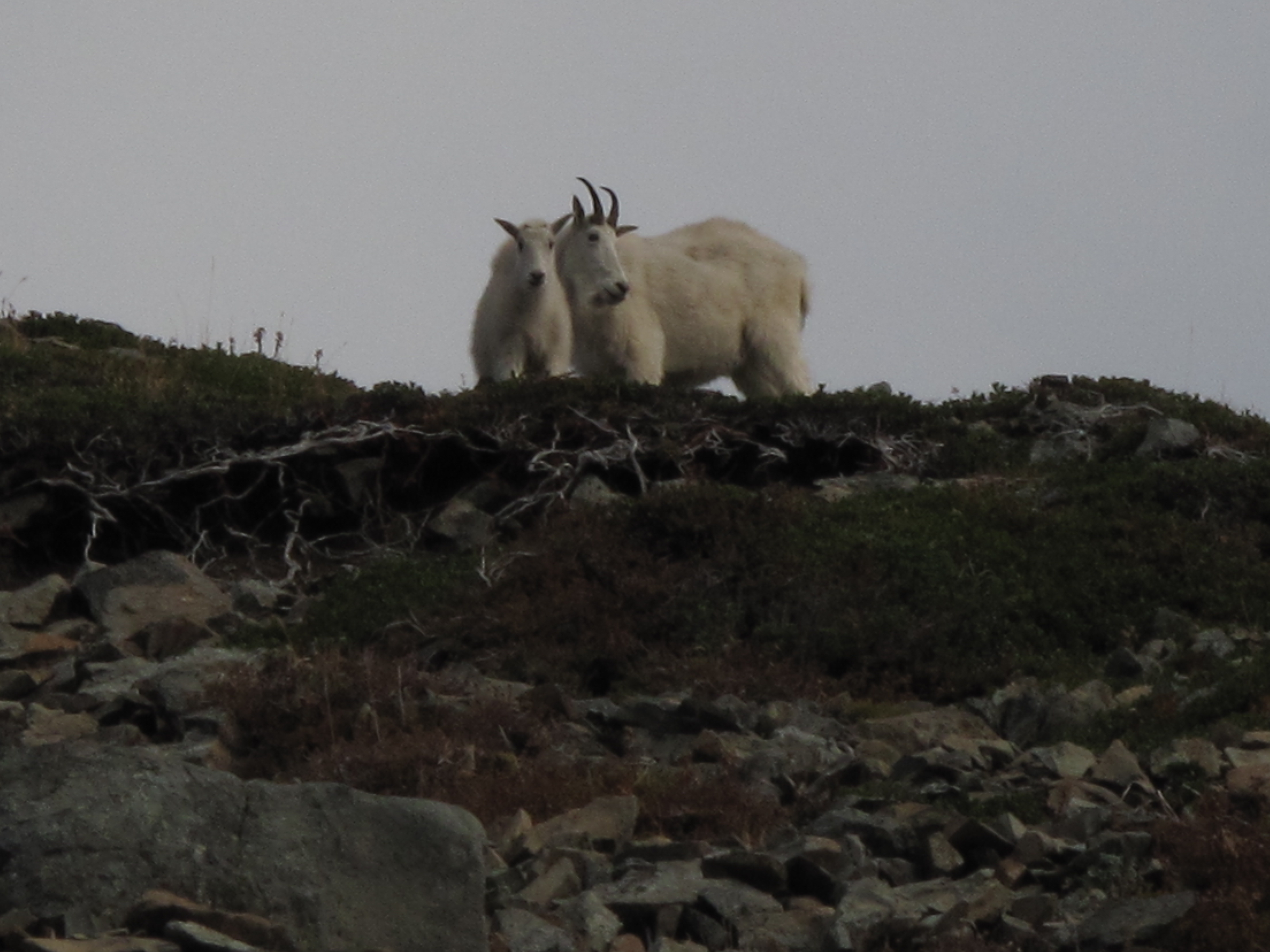 Upon reaching the summit, I found the goats in close proximity, so I decided to try 2M FM, despite the fact that I had my full HF rig & antenna with me at the summit. I made 5 contacts in about 25 minutes, while my wife kept a wary eye on the goats. As the herd was edging closer to the summit, and not being sure of their intentions or disposition, I made a hasty retreat down to the trail. My movements made the herd a little jumpy. Rather than head back up to the summit, we decided to hike around elsewhere, and headed out towards Frozen Lake and Burroughs Mountain(s). By then we had occasional glimpses of Mount Rainier, and surrounding areas, and so were satisfied with that. I hope to return for a more liesurly Activation, and try HF from the summit.