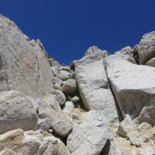 Day 3, hike / scrabmle up Mount Langley, 14,042 feet. This route was 11.5 miles round trip, and 3,700 feet elevation gain. The climb involved going back over "New Army Pass", at 12,230 feet. Then you need to drop 400 feet elevation and re-gain it, before continuing to summit of Mount Langley. The final summit section route we chose is the "3rd Class Variation", climbing over a very nice steep section of large and medium size granite boulders to gain the summit plateu, and then the summit. On the way back to camp, through New Army Pass, we again had to re-gain the 400 feet previously dropped. All together we saw 4 other people on the peak that day.