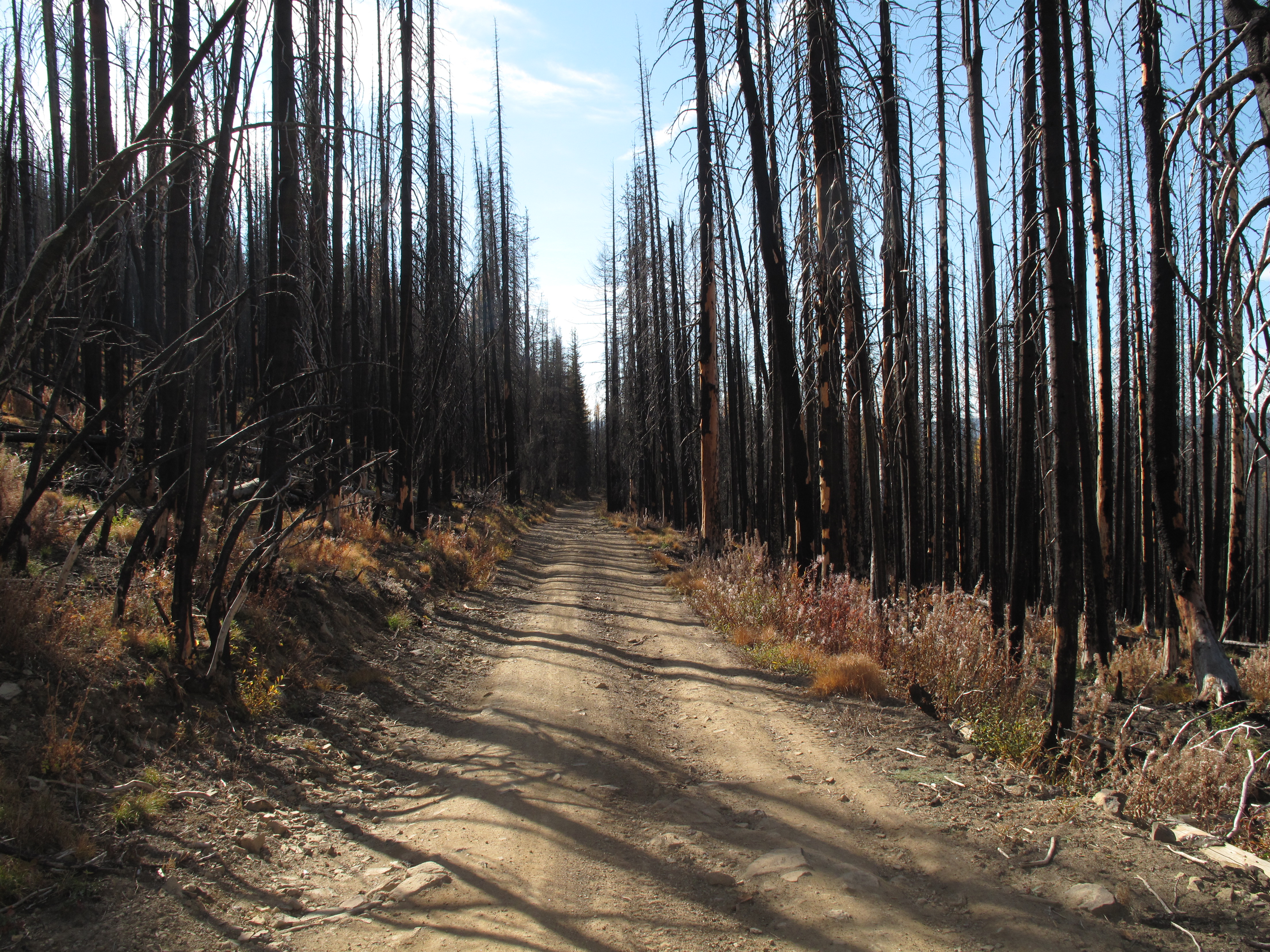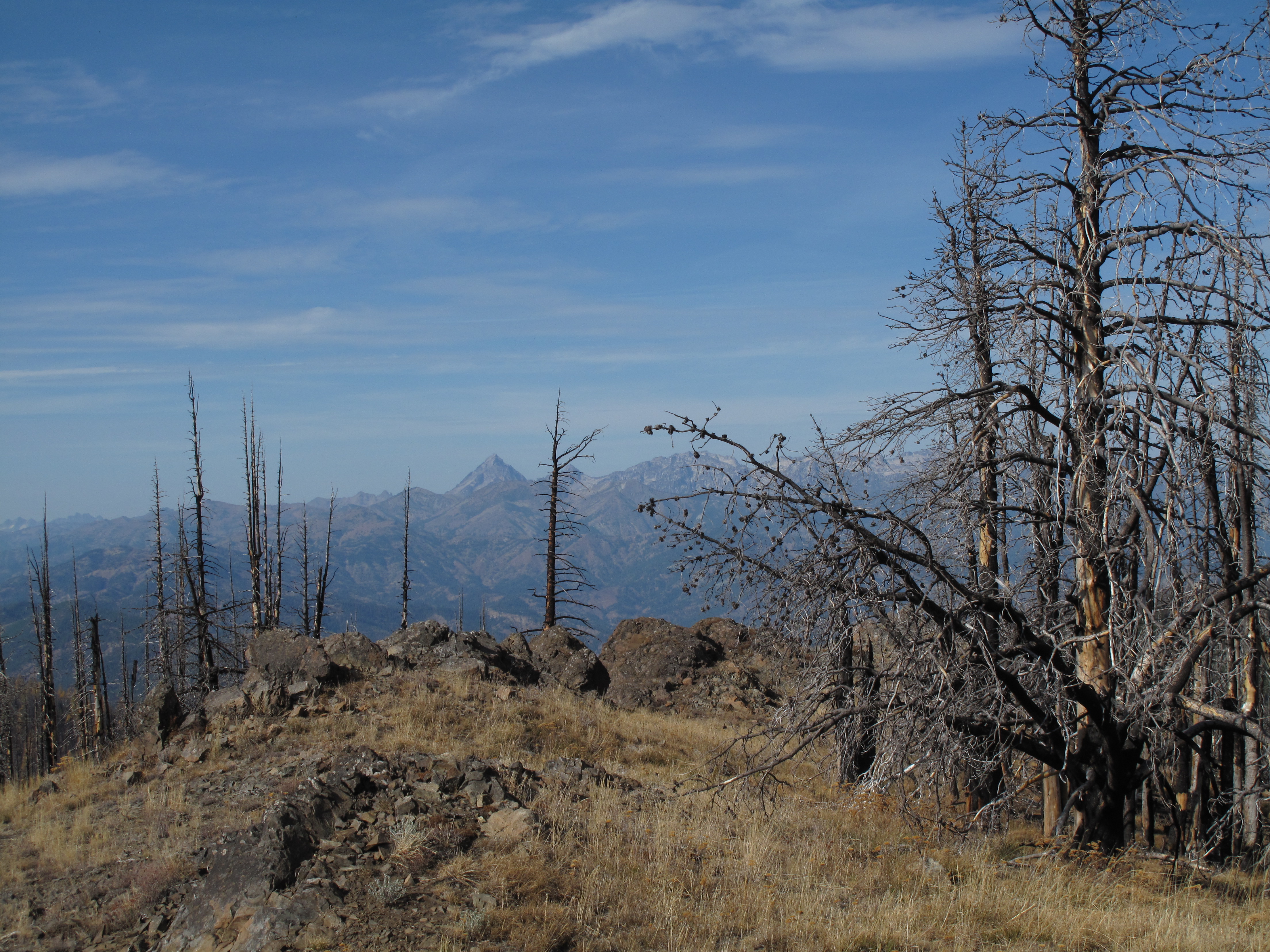 This was my second attempt to Activate Mount Lillian South. The first time there, I only managed 1 or 2 contacts, and did not list the attempt as an Activation on the SOTA Database. In retrospect, I regret that Activation was not successful, as the area has changed dramatically due to substantial forest fires. What once was a very nice area of mixed pine, larch and deciduous trees is now a charred mess in most of the area adjacent to the summit formation of Mount Lillian South. An interesting note: The SOTA Summit in question is Mount Lillian South. What shows on the USGS maps as Mount Lillian is the North Summit, 6,120 feet, and approximately 3/4 mile due north of the SOTA Summit, Mount Lillian South, 6,191. Mount Lillian South is only identified on USGS maps as Point 6,191. The coordinates listed for Mount Lillian South in the SOTA Mapping web site are correct, and match what I found in the field.