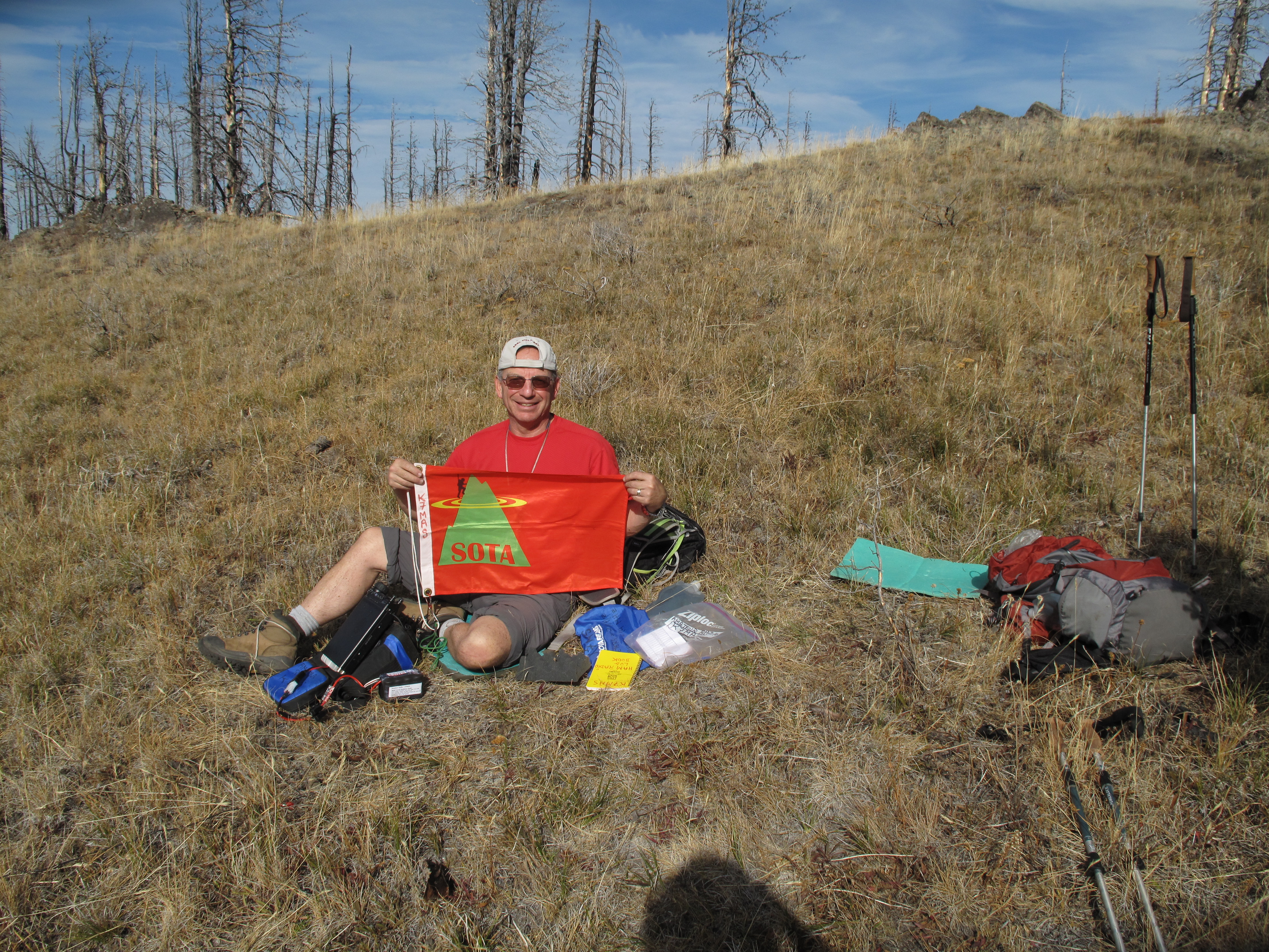 We set up quickly for HF operation, using my Yaesu FT-857D, powered by LIPO batteries, and an Inverted V Linked Dipole for 20- 40 Meters, slung from a 25 foot carbon fiber mast. Band conditions were excellent on 40M, but I had no luck on 20M. In quick order, I had a bunch of Chasers in a mini pile-up. I made 13X 40M contacts in the span of about 22 minutes, while describing the blackened surroundings, and the more distant views of Mount Stuart, the Wenatchee Mountains, and in the distance Glacier Peak.