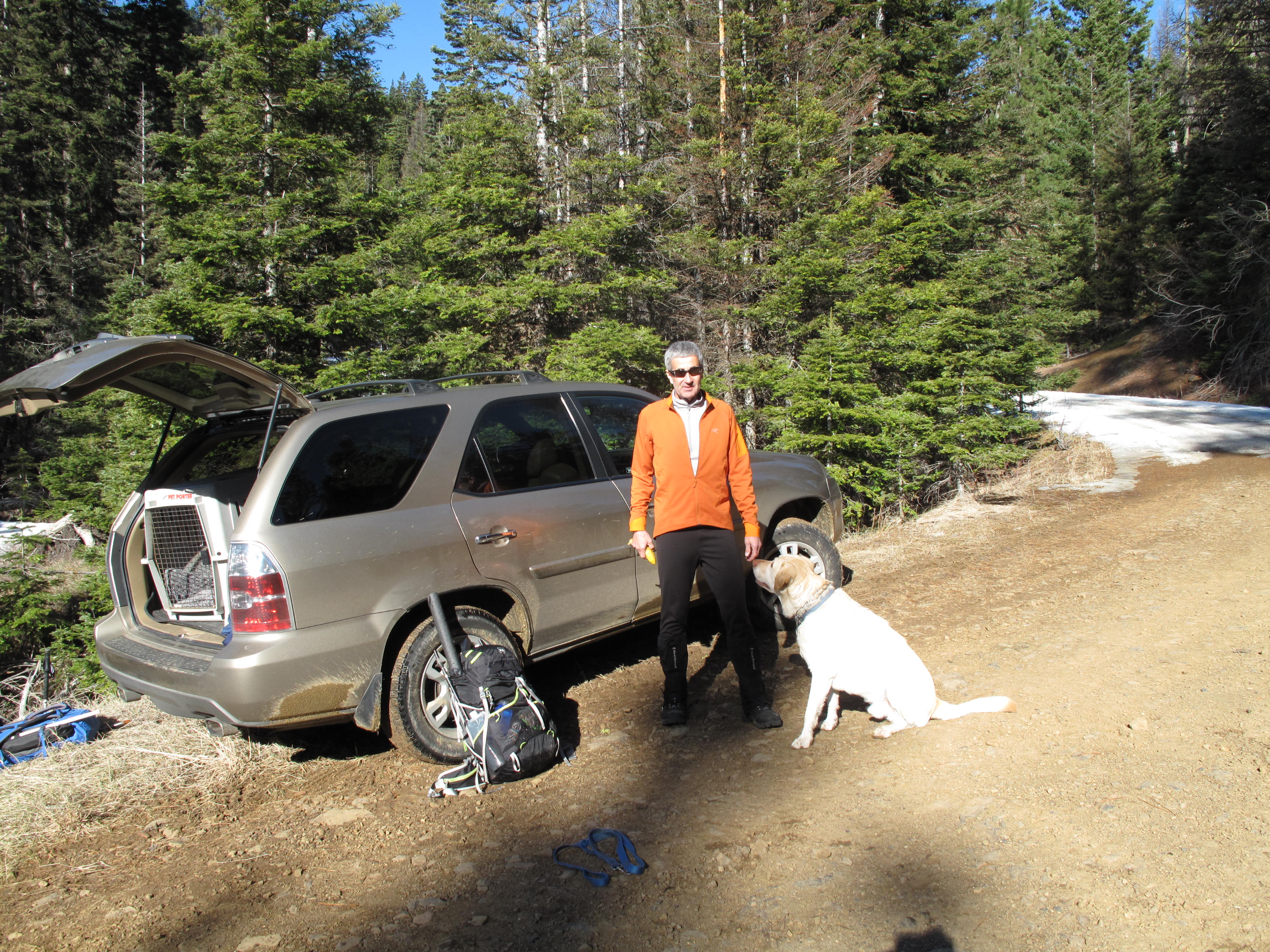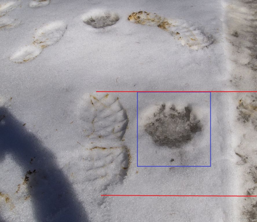 Red Top Lookout is accessible off Forest Service Roads: #9738 then #9702, from SR-97, the Cle Elum to Leavenworth State Road traversing Blewett Pass. We managed to drive FR# 9702 to an elevation of 4,360 feet +/-. Not wanting to risk the increasingly deeper snow on the north and east facing and shadowed gravel road, we parked the car and headed up. We stayed on FR #9702 southbound for a bit, then took a northbound stub logging road, identified as FR 644 on the 2003 vintage USGS map I used for research. Once #644 petered out we traveled cross country over mixed snow, talus and open forest NNW towards the Teanaway Ridge crest. We gained #9702 again, and stayed on road / trail northbound the rest of the way to the summit. The round trip distance was 3.5 miles, with an elevation gain of 1,000 feet. Towards the summit rock formation, we started seeing feline paw prints in the snow. They were so large, that at first we mistook them for bear tracks. Upon closer examination, we could clearly see the pads and claw marks indicating a BIG CAT! See pictures below. We felt the tracks were probably a few days old, as it has not snowed in the area for approximately 9 days. The tracks were huge, and probably those of a Cougar: http://en.wikipedia.org/wiki/Cougar. Even though Dexter the SOTA Dog is about 92 lbs., he would be no match for a mature Cougar. Luckily, all we saw of the Cougar was the paw prints. We did see plenty of evidence of recent deer, elk and other animal passages of Teanaway Ridge on our route through the mud and snow.