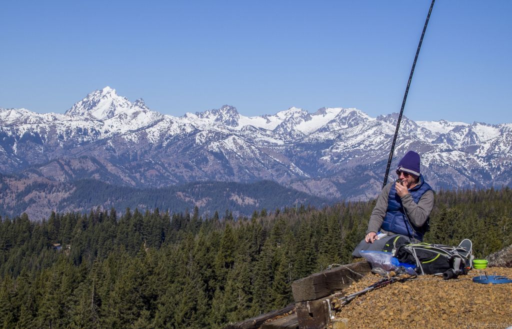 Winter Activation of Red Top Mountain Lookout together with Tim Nair, KG7EJT. Red Top Mountain Lookout is 5,361 feet elevation (1,634 meters), and is located approximately 15 miles NNE of Cle Elum, Washington. There have been several activations of Red Top Mountain before, but none in winter. Great weather, very manageable snow, great views and good company, including Dexter the SOTA Dog, made for a fine activation!