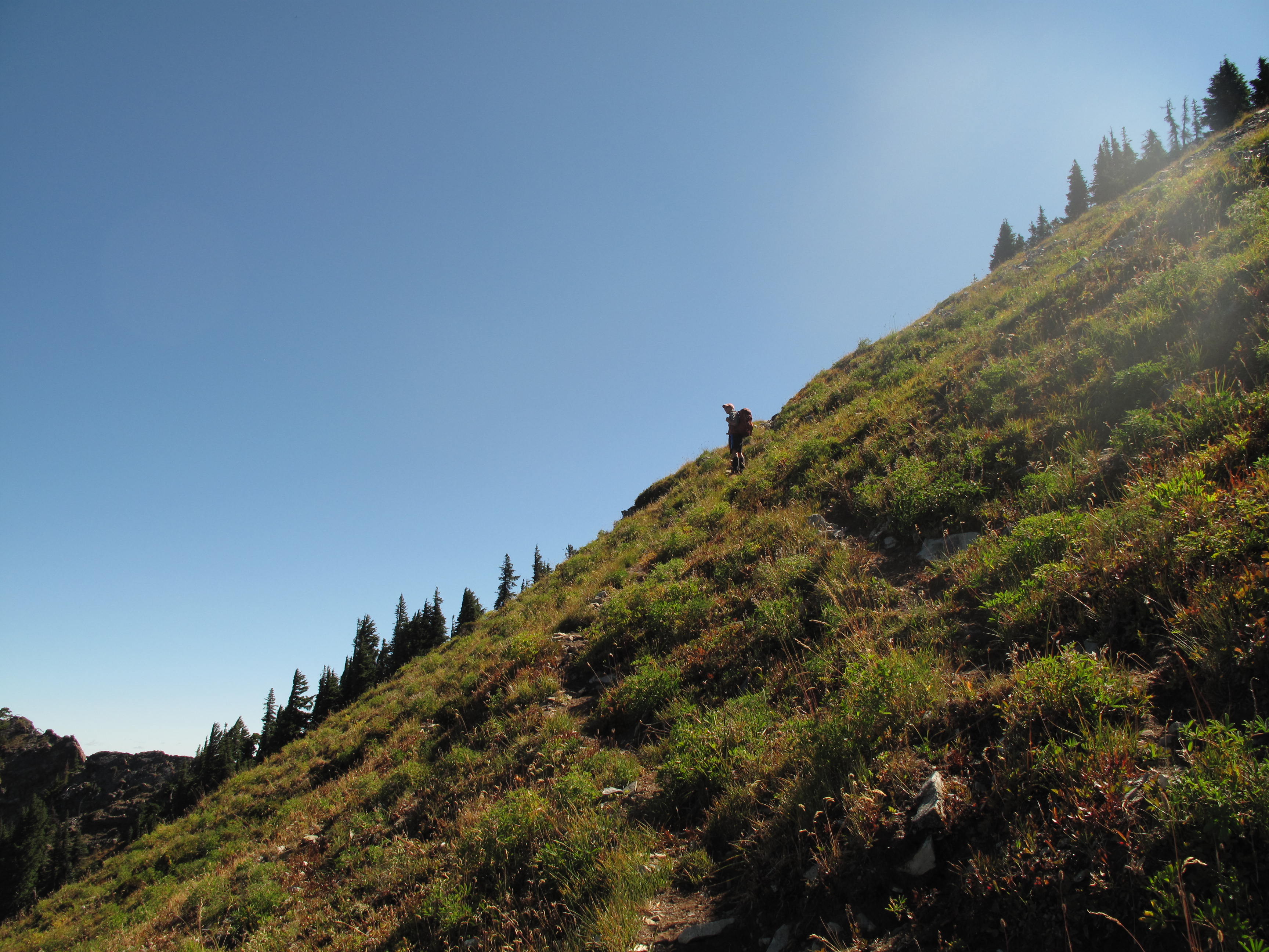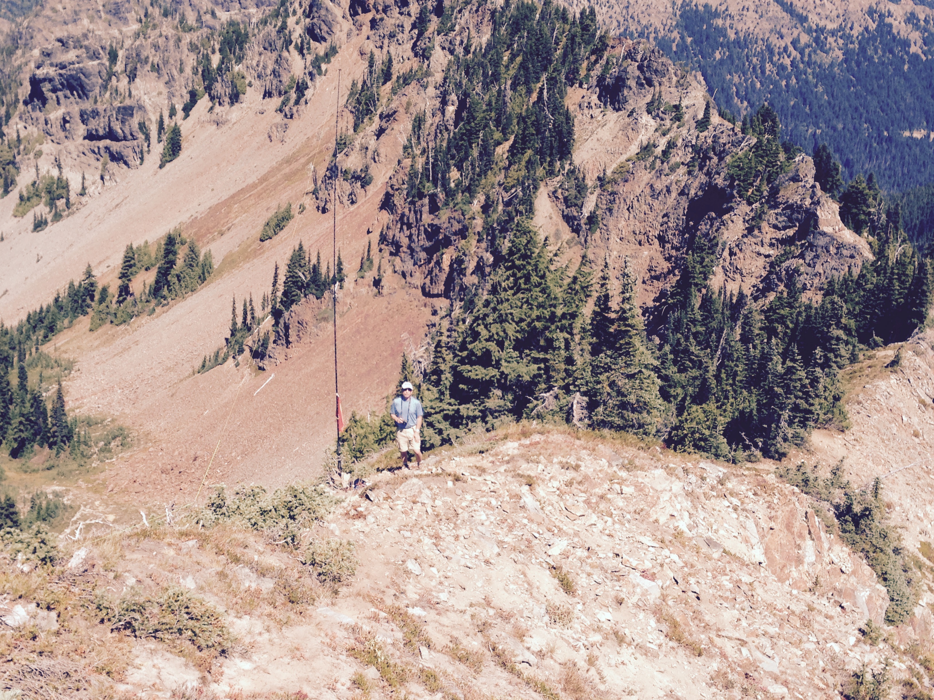 While my companions, both not Ham's, sacked out and ate lunch in the sun, with hardly a slight breeze, I descended about 30 feet vertical to the north, in order to set up my Operating Position. There was not enough room on the summit to set up an HF station, with an Inverted V dipole for 40M + 20M. I found a pleasant little bench, with a small stunted evergreen, sufficient to support my 25 foot carbon fiber fishing pole and the wire antenna. I made a total of 9 - 40M contacts in about 1/2 hour of operating. After breaking down the HF gear, on a lark, I called CQ on 2M FM, and to my delight, I worked WW7D, on his way to an activation of Chinook Peak, several miles to the NW. I also learned that my friend Tim, KG7EJT was attempting a Crystal Mountain activation, also a few mile NW. Although I did not manage a S2S contact with them, I did work both of them later in the afternoon, while they were on their respective summits, and I was on the climb up from Dewey Lake.