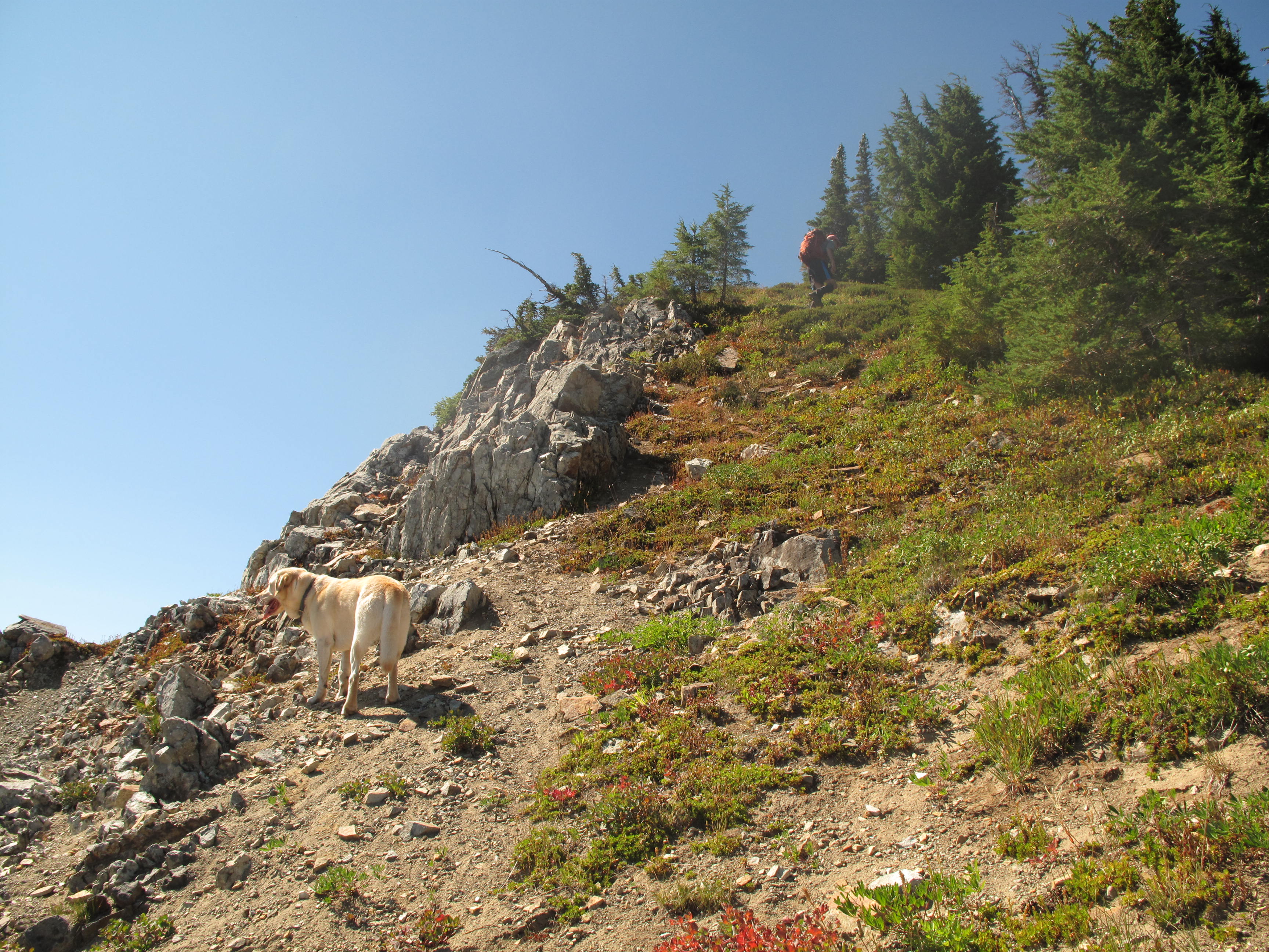 On a beautiful Sunday morning we departed the TH at Chinook Pass at approximately 9:00 AM, just ahead of the hordes of hikers that would be on the PCT / Naches Peak Loop later in the day. The recent thunderstorms, rain and wind cleared out much of the haze that would otherwise have filtered over from the fires raging in various eastern parts of the state at this time. We made quick work of the PCT portion of the route, despite the dogs taking a swim in a little pond along the way. We reached the obvious XC route beginning, turning almost due east towards Tahtlum Peak, in short order. This point is just east of point 6,046 on the map. Despite the previous reports describing circumventing on the south the two "bumps" along the ridge trending towards the base of Tahtlum Peak, we decided to go up and over them. From the top of the second "bump" we had to drop 210 feet on a steepish rotten slope between the cliff bands. Not too difficult, but easily avoided by travelling a little to the south, below the "bumps". From the low spot on the ridge, we ascended 830 feet on west ridge and then NW face of Tahtlum Peak to the summit. We found the summit as described, a smallish flat gravel area of about 6 X 6 feet, with cliffs on three sides.