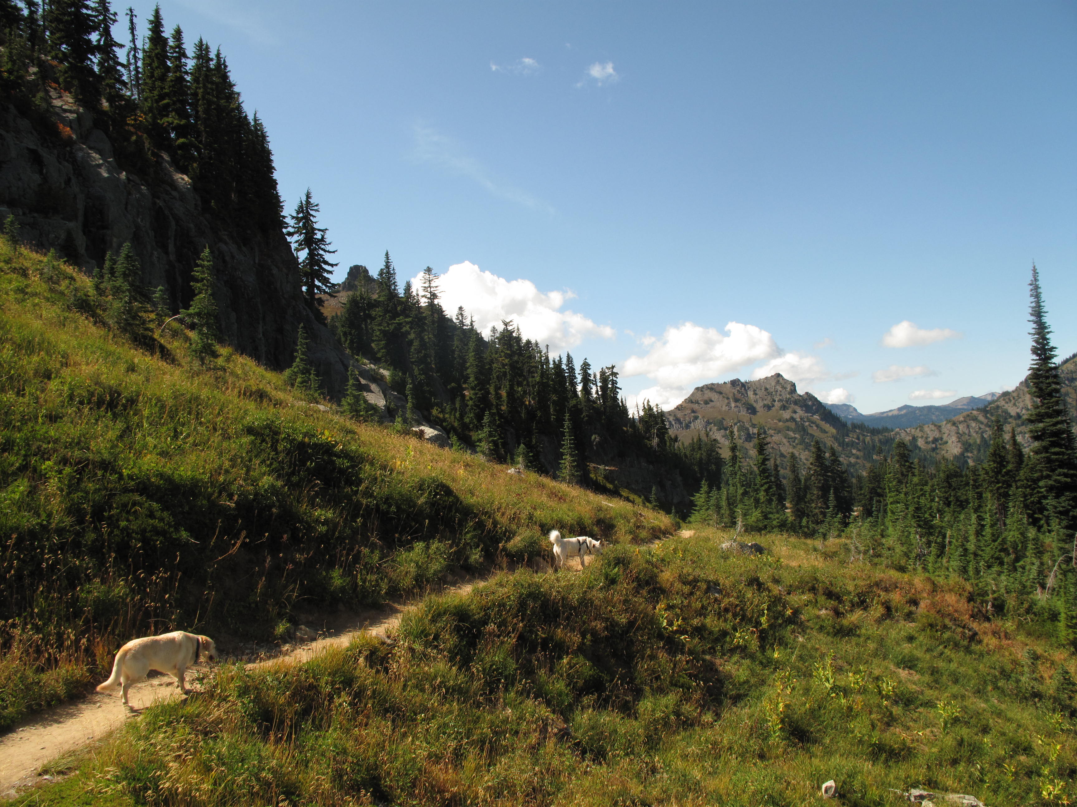 The crystal blue waters of Dewey Lake(s), about 1,440 feet below us, beckoned powerfully on the sun splashed summit, so we decided to go for a swim. Descending from the summit block to the west ridge of Tahtlum Peak, we then dropped about 1,250 feet in about a half mile down the south face of Tahtlum Peak directly to Dewey Lake. There we enjoyed a half hour of swimming in the very "bracing" water. The dogs, especially Dexter the SOTA Dog (being a Labrador Retriever), enjoyed retrieving sticks from the lake. We then climbed out of the lake basin some 730 feet to the junction of PCT and the Naches Peak Loop Trail, where we had taken off XC a few hours before. An uneventful return to the TH along the PCT ensued. On this last stretch of the hike, the expected hordes of hikers were out enjoying the fantastic weather and great views typical of this very popular area.