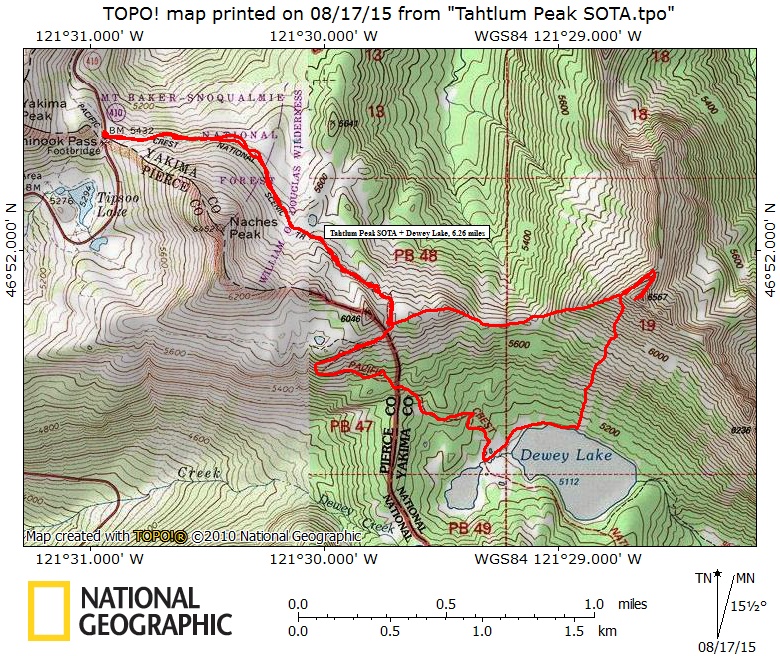 An 8 point SOTA Summit, activated on a beautiful, clear summer day, with good company, a successaful activation and capped off with a bracing swim in Dewey Lake made for a very memorable outing. Approximately 6.25 Miles total travel and 2,100 feet gain, including the side trip to Dewey Lake, and climb out of the lake basin back to PCT / Naches Peak Loop Trail junction.
