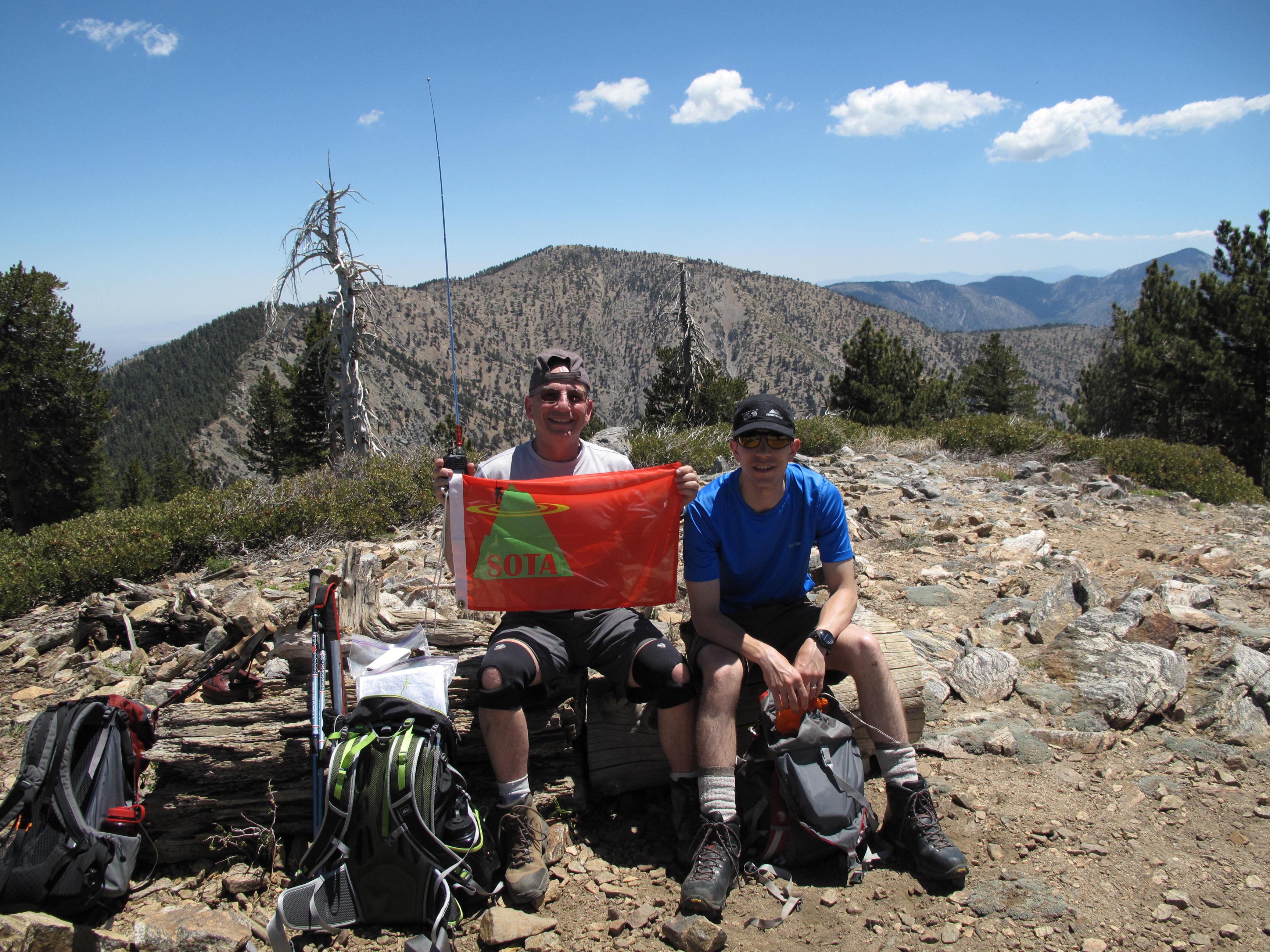 All of my contacts were 2M fm, using my trusty 7 watt Icom IC-V85 hand held + AEA telescoping Hot Rod antenna. I had planned on using 20M ssb on my Yaesu Ft-857D and Inverted V antenna, laboriously carried all the way up and over the Throop Peak / Mount Baden Powell Traverse, but my wife was suffering from high altitude sickness due to lack of acclimatization. For some people, it is difficult to go from sea level to 9,400 feet in 3 hours without suffering occasionally. I have climbed over 14,000 feet many times, and don’t seem to be as affected. Due to my wife’s condition, we only stayed on the summits of Throop Peak and Mount Baden Powell about 40 minutes each. The entire traverse took about 6½ hours car to car.