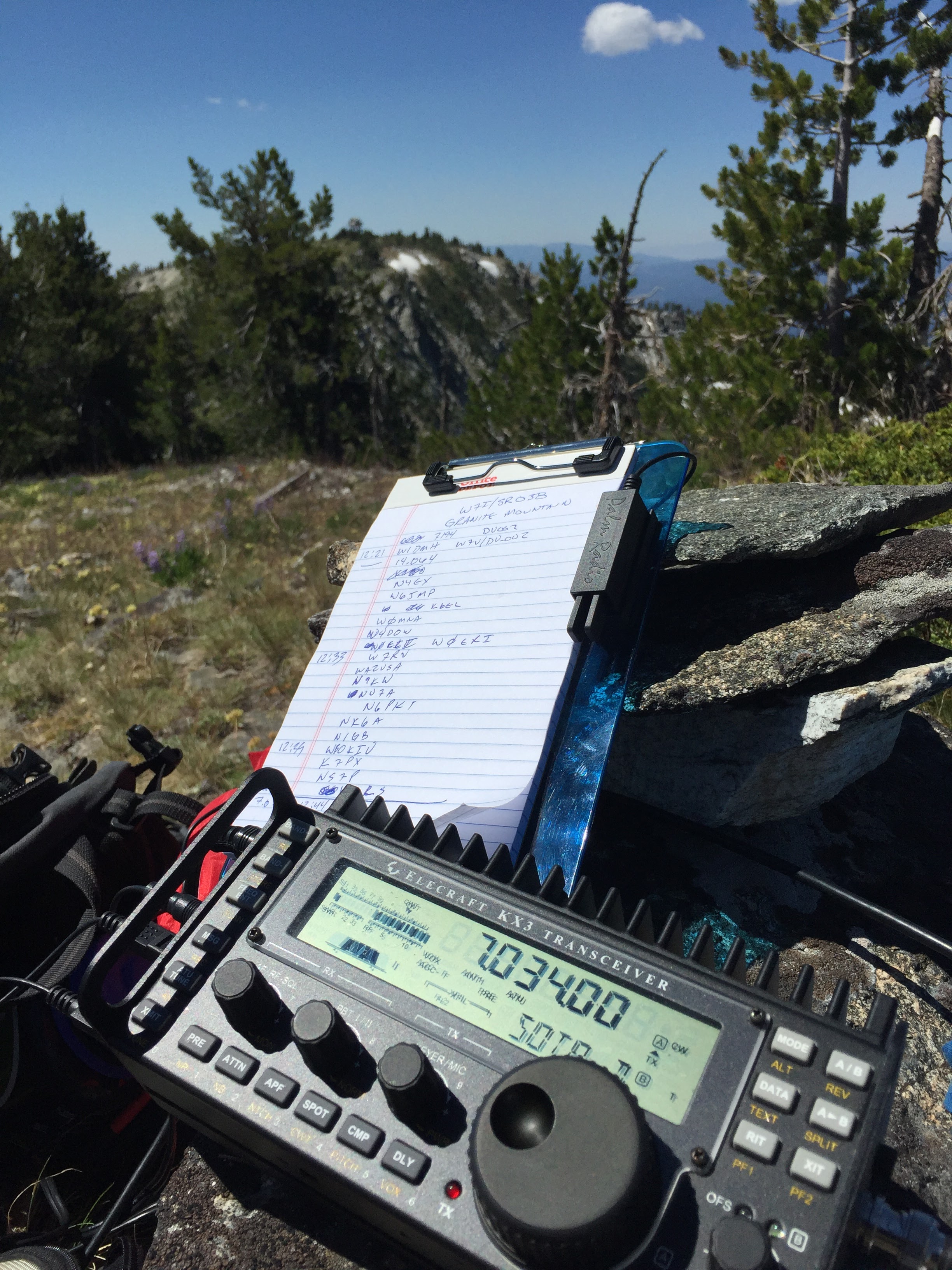 It’s a quick trip down to the saddle then a short bushwack over good ground up to the SOTA summit.  There are a selection of short stumps and snag trees to strap a SOTA pole onto.  Probably can even get away with tossing a wire over the tree just below the summit.  This was another one of my 100% CW summits as I am working on my CW skills.  No problems working all the regular chasers on CW.  I made a quick trip to 20M SSB, but no takers.  20M and 40M CW was enough to put quite a few in the log.  This was also the maiden voyage of my clipboard paddle holder.  Found inspiration on the web for this, but basically just a couple metal washers double-stick taped to the clip board to hold the tiny, but awesome pico paddle from Palm.