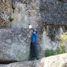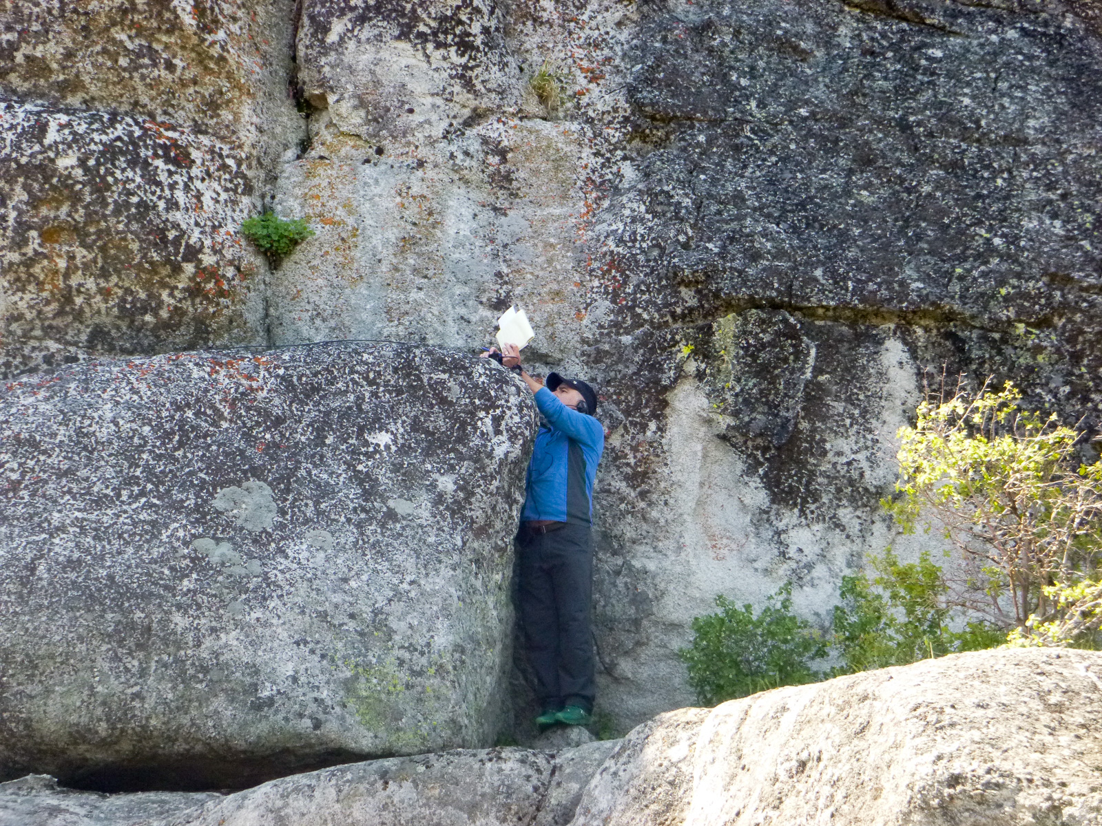 The second choice was to find a spot on either side of Stack Rock that was within the 80 ft activation zone required by the Idaho rules.  From topo maps and by eyeing it up in person, it appeared the south side was greater than 80ft from the top.  This is the side you will first approach from the trail and is the side where the scramble to the top is.  We really wanted to find a spot where future non-climber activators could access and re-activate the summit, so we circumnavigated the summit and found that the north shoulder was higher.  This was confirmed on the topo maps and a reading of 5815 ft on my GPS matched what Google Earth said it should be over there.  5815 was exactly 80ft shy of the summit.  To further verify the activation zone I held up my 30ft pole to estimate the distance to the top.  It appeared that 2 pole lengths and another 20ft was just about right to reach the summit.  So we were pretty confident this shoulder was within the activation zone.  However, to give us a little leeway, I set the KX3 up ontop of a 8ft boulder to put me firmly in the activation zone.