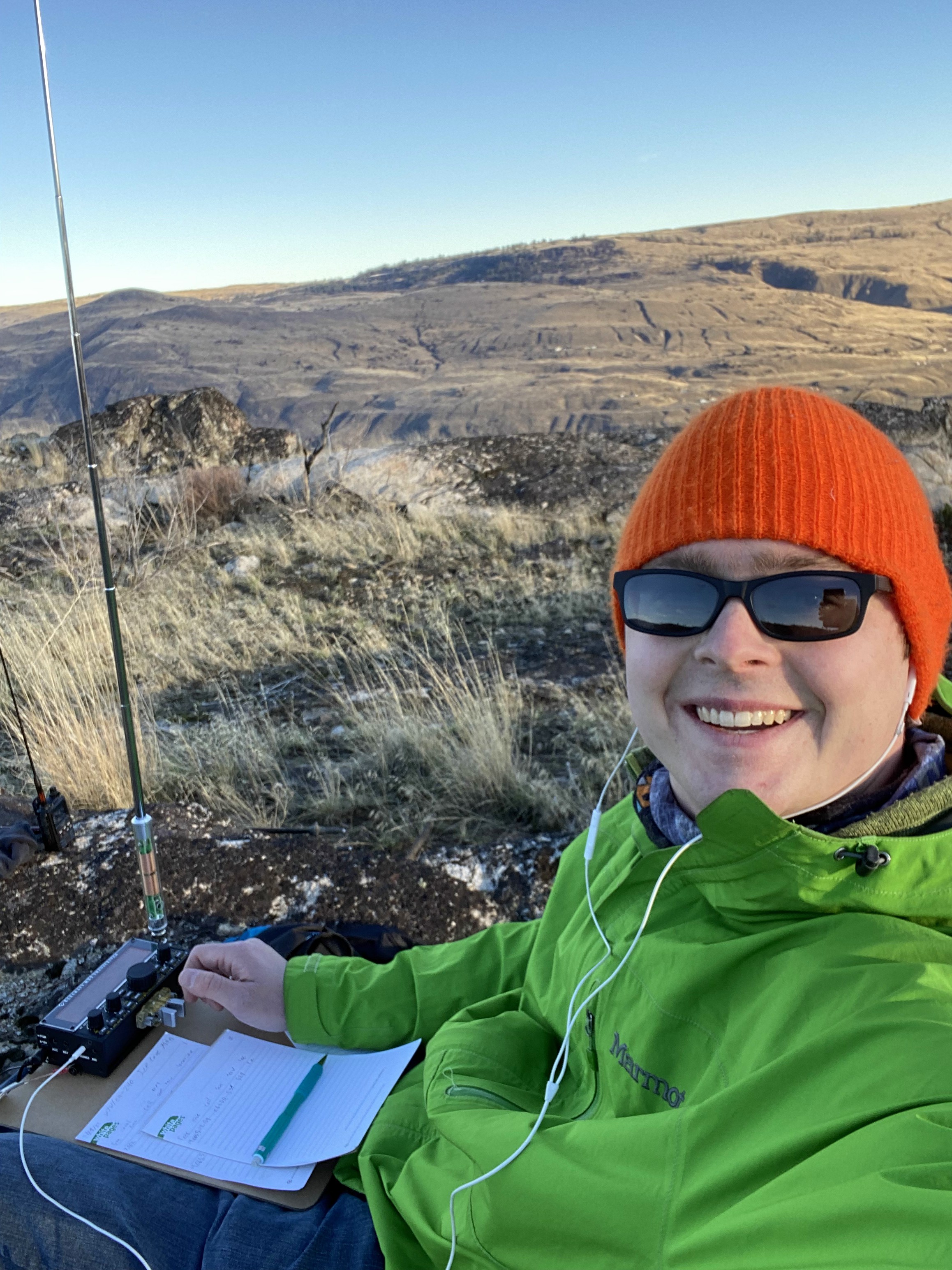 At the summit, I found a few trees, but none that looked like they would make good antenna supports. The best candidate was growing out of the cliff, and I didn't think that I could get an antenna hoisted from it without getting too close to the cliff. So, I set up my AX1 with several radials and got on the air. I made 16 contacts around the US on 40 m and 20 m CW. It was sunny and surprisingly temperate for late November, so I was quite comfortable on the summit, but I packed up at 3 PM so as to allow enough time to hike down before it got dark.
