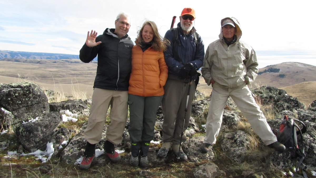 5194 is very close to the two Findley Buttes and it would be very easy to activate all three on the same day (but see K7ATN's entry for Findley Buttes West as access is a bit ambiguous). Like the Findley Buttes, it's part of the Zumwalt Prairie Preserve - read about it here: http://www.nature.org/cs/groups/webcontent/@web/@oregon/documents/document/prd_020393.pdf Head east on Highway 82 about 3 miles from Enterprise to turn left onto Crow Creek Road and head mostly east about four miles. Turn onto Zumwalt-Imnaha Road and go another 16 miles or so. A GPS might be useful here to make certain you are heading to the correct summit. You'll find a place to park just east of the summit where two gates are opposite (don't block the gates). Head up the road towards the summit and then take the informal trail that leads up to the rimrock just below the summit. You'll find that skirting the rimrock to the south makes for an easier ascent to the actual summit. Total hiking distance is about 0.8 miles with 700 feet of elevation gain. There are good places to sit here, but no trees or even shrubs to support antennas. The views from here, just like anywhere in Wallowa County, are fantastic. Pictured are K7ATN, K7NIT, KC7DM and KD7WD - quite a crew for this activation.