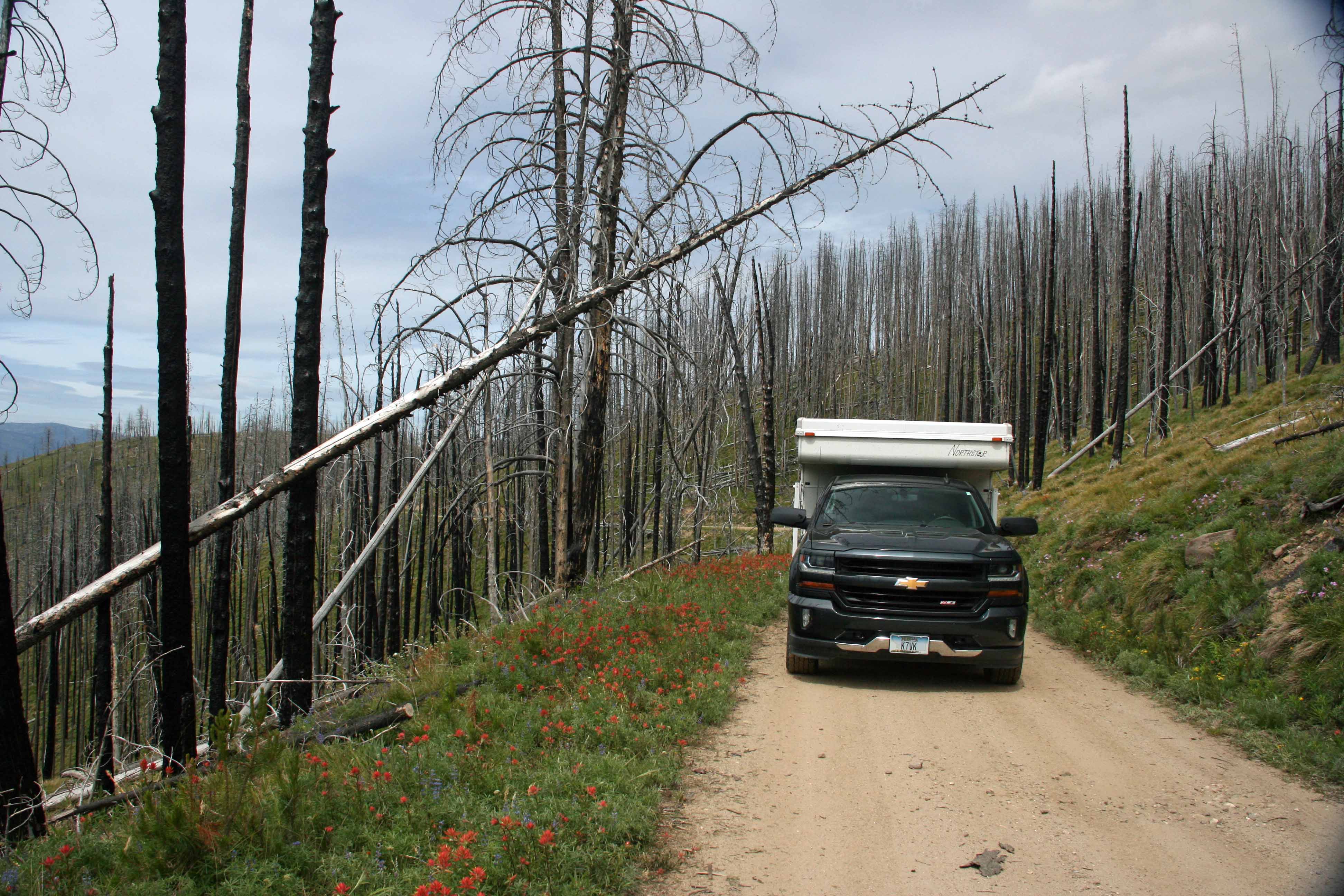 Large areas of this landscape have been burned in wildland fire. Travel at times is through snag-filled forest. Beware of where you park, camp and travel especially on windy days. A saw can be handy in case any trees block your route.