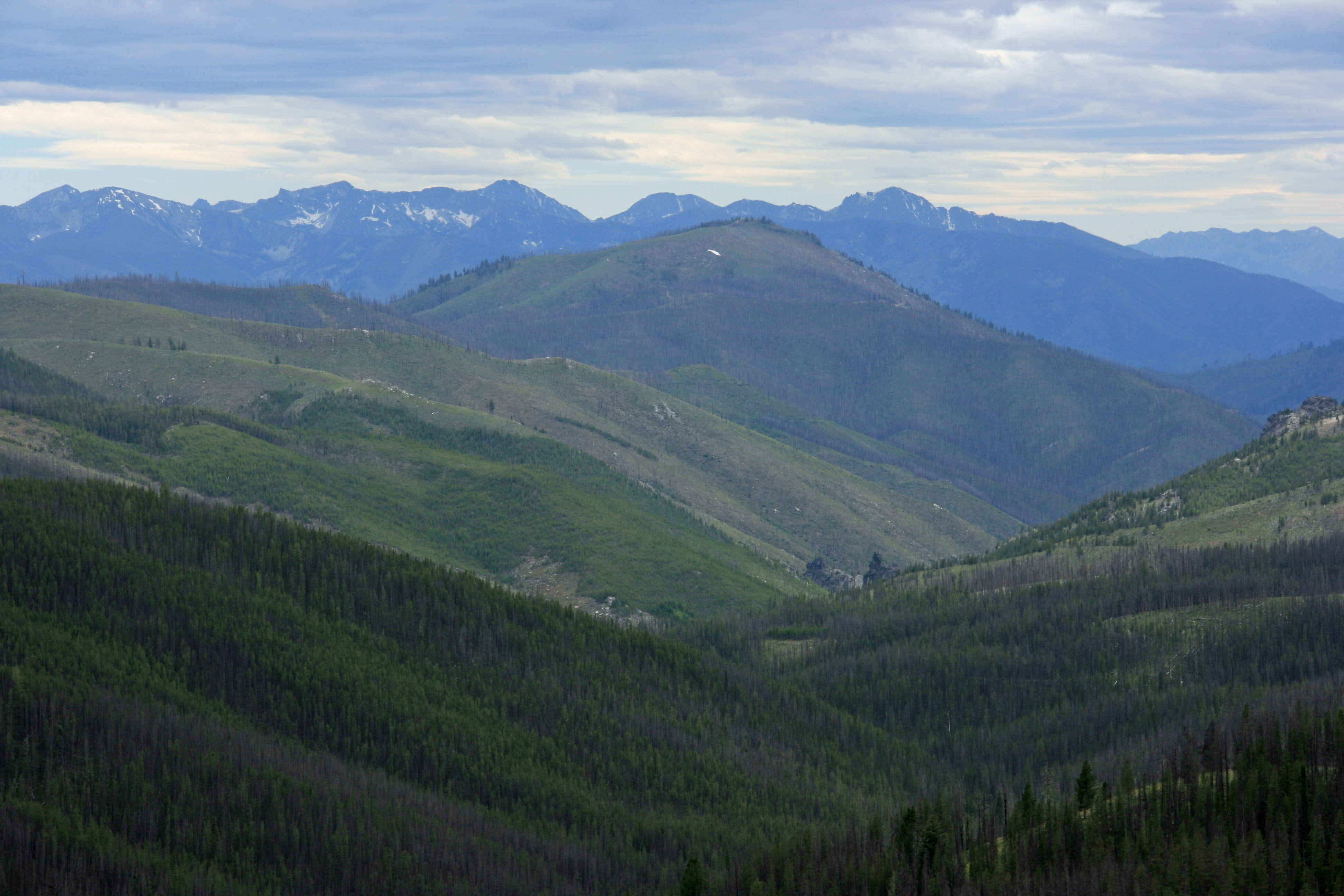 This Idaho/Montana border summit is an easy ‘walk-up’ from US Forest Service Road #044. The summit is on the Idaho/Montana border. From the summit are good views of the steep slopes of the Salmon River Canyon and high summits in the Frank Church River of No Return Wilderness. There are several summits along this road for multiple summit days, provided one is camped nearby. Road 044 and side roads are popular ATV travel routes.