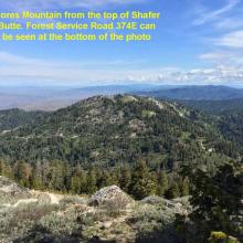 From the picnic area getting up to Shafer Butte is pretty easy. A nice trail/jeep track heads off south from the group parking area. The trail shows up quite well on Google Maps. There are a number of switchbacks on the way up, some of which have "now which way" decisions to make. It seems if you just make the choice of "when in doubt just keep climbing" you will make the right choice. It took us about 35 minutes to make the 1.75 mile and 850 foot vertical climb. Along the way we encountered just a couple patches of snow in the shadiest part of the trail. You can also get to the summit from the upper parking lot at the ski area if you want a different route.