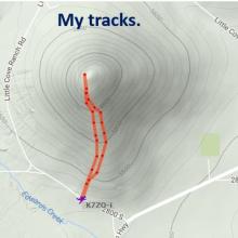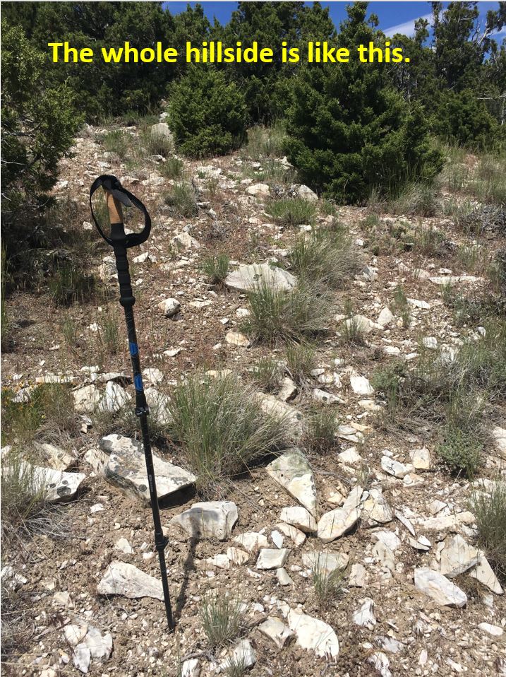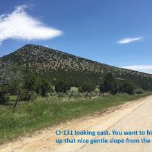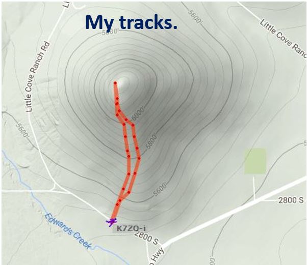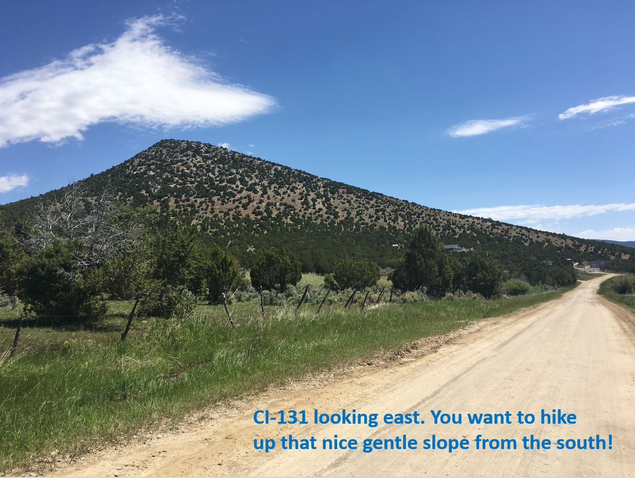 There are no trails up to the summit. So, you just need to park and head off. You definitely want to come in from the south side as it is a much more do-able hike. I am not sure I would say easy -- it is around 700' in about a half mile. The junipers are not so thick that you lose sight of the summit for long on the way up. You do not want to get any further west than my tracks as shown below as the hillside gets even rockier than it already is. (Another route would be to park at the cemetery on the southeast side and come up that way. There is a bit more elevation gain that way and the junipers seem to be a bit thicker.)