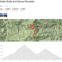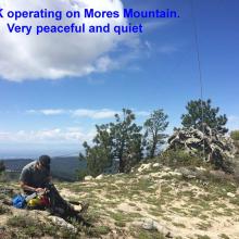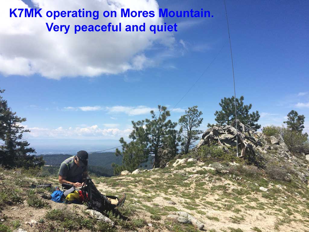 The hike back down to the picnic area was uneventful then it was off to Mores Mountain on a well marked nature trail. This is an easier hike taking us just 25 minutes to reach the summit in about a mile and 550 feet of vertical. Setup was easy and from this location cell phone connectivity was solid with no local RF issues like on top of Shafer Butte. Our operation was even briefer with K7MK making 5 QSOs on 20M SSB and handing the mic over to K7ZO for a quick few more followed by a short QSY to 40M for the west coast folks. Tear down took less than three minutes. We feel like we are a NASCAR or Grand Prix pit crew with a well timed coordinated effort getting everything into the backpack. Then it was a hike back around the nature trail loop and back down the Forest Service Road to the car. By now it was around noon and as we hiked down the road to the car we passed many families hiking up. They too were probably surprised by the gate still closed at the bottom of the road. But with a car full of energetic kids the last thing they were going to do was turn the car around and head back down the hill without burning off some of their energy. When we got back to the car our total hike was 8.6 miles with 1,956 feet of elevation gain for the day. Total moving time was a bit less than three hours. If we had been able to drive to the parking lot out numbers would have been 6 miles of hiking with 1,556 feet of elevation gain. Our GPX tracks have been uploaded to the SOTA mapping project.