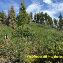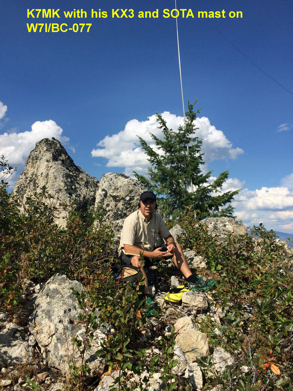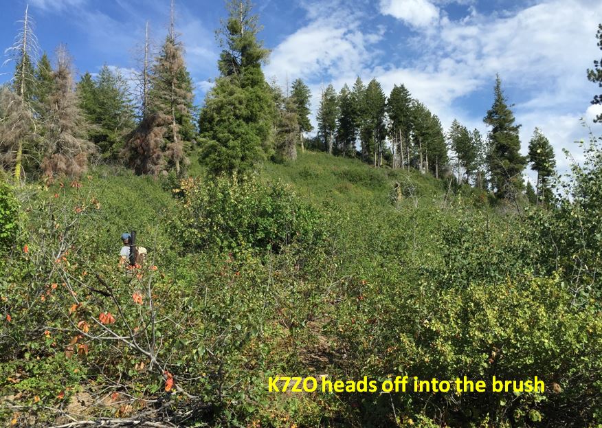 K7ZO had hauled his SOTAbeam dipole up with him and really wanted to give it a try. However the amount of brush in the activation area meant it would have been a study in frustration as all the wires and strings would get tangled around every twig and branch. So we went with K7MK's KX3 Helper End Fed antenna attached to his SOTAbeam travel mast. We did use K7ZO's TS-480 running at 50 watts for a little more power than our usual 10-12 watts from K7MK's KX3.