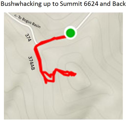 There is no trail to this summit so you get to pick your route through the brush. We hiked a hundred yards or so down 374AB and then headed on up. It was pretty much bushwhacking the whole way up except where we walked through areas that firewood cutters had cleared or where elk had created vague game trails. Finding your way to the summit is really easy. Just keep heading up hill and you will get there. Luckily the total climb is only a little over 200 feet and when you reach the summit there are a few rock outcroppings indicating you have arrived. By this time it was about 4:45PM and we knew the day was getting long.