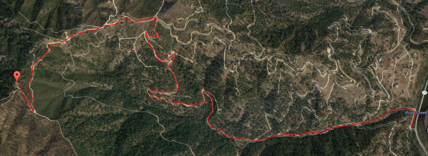 K7MK and I headed out on a somewhat blustery spring day for our second ever activation. With snow still on higher peaks and Forest Service roads not opening up until April 30th we headed to this nearby 1 pointer. Per Google Earth and other satellite imagery we knew there was a private home on the actual summit. But, it had been activated once before and the terrain looked like we should be able to find a spot in the activation zone somewhere to setup. Actually getting to this summit is a bit of a navigation challenge. After taking the Rush Creek Road exit off of Idaho 21 you immediately find yourself in a maze of dirt roads through the trees. There are tight switchbacks, intersections galore (each needing at least one "Where do we go" decision) and you are in the trees so you can't see where you are trying to get to. We were sort of following maps our phones but once ended up in a dead end that we thought was the direct road to the summit. After backtracking and taking a different route we finally made it.(See annotated map for our eventual route.)